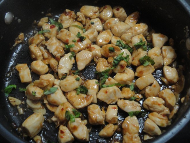 Combine fish sauce (which I omitted), sugar, soy sauce, water, sambal oelek, and salt in a small bowl, stirring with a whisk. Add sauce mixture to the pan and cook for 1 minute or until mixture thickens making sure to coat the chicken. Remove from heat.