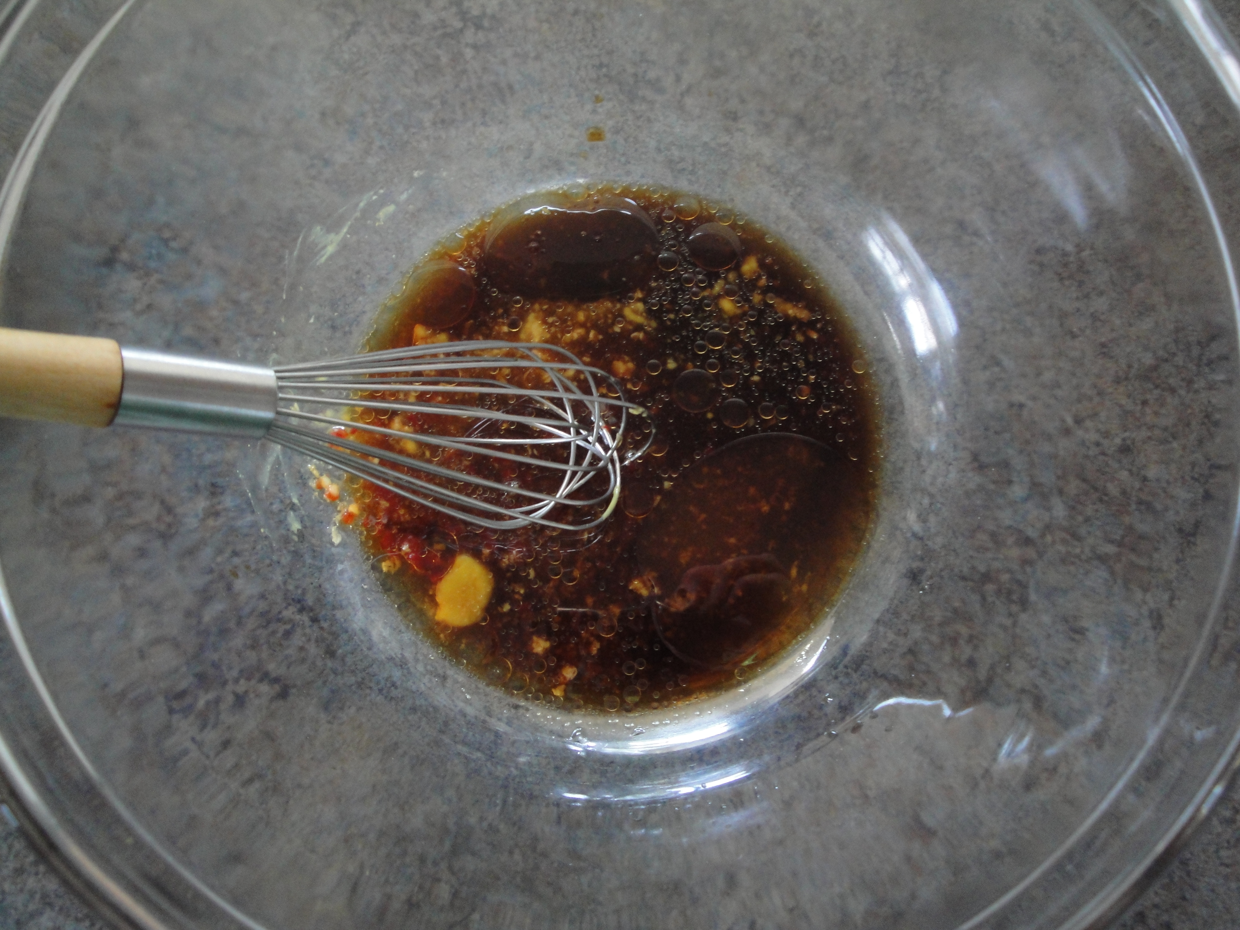 In a large bowl, combine soy sauce, rice vinegar, sesame oil, honey, Chinese mustard, ginger, and chile paste (sambal oelek) with a whisk.
