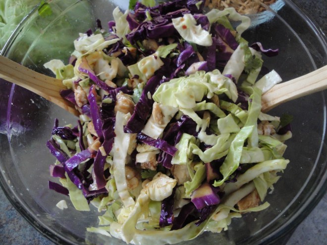 Add in cabbages, chicken, and cilantro and toss gently to coat.