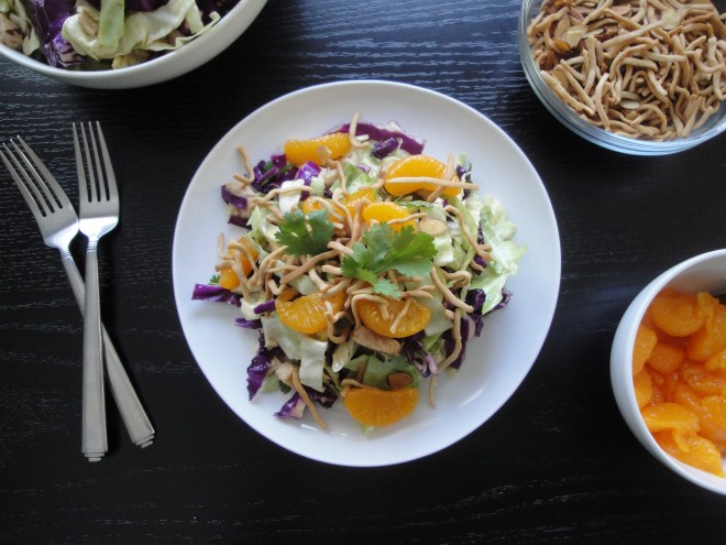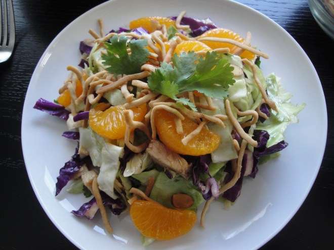 But since this blog is making me expand my horizons a little, I boldly lifted two different kinds of cabbage into my grocery cart this weekend in order to make Asian Chicken Salad. Napa cabbage and red cabbage are mixed with chopped chicken and cilantro and tossed with a spicy, gingery, Asian dressing. The dressing calls for Chinese mustard (I got mine from a leftover Chinese food packet!) but if you don’t have any, I think dijon or even yellow mustard would work. The dressing gets heat from the chile paste and a slight sweetness from honey. Topping it all of are toasted almonds and Chinese noodles (I used chow mein noodles) which add a buttery crunch and sweet, juicy mandarin oranges. This is a great salad which will travel well for a picnic or, if you plan on eating it over a few days, toss the dressing when you are ready to eat to keep the cabbage from getting soggy. Don’t be intimidated by the list of ingredients in this recipe (which is one of Cooking Light Magazine‘s Superfast recipes) because if you use precooked chicken, it can be made in less than 20 minutes. This is one salad I won’t mind eating everyday.