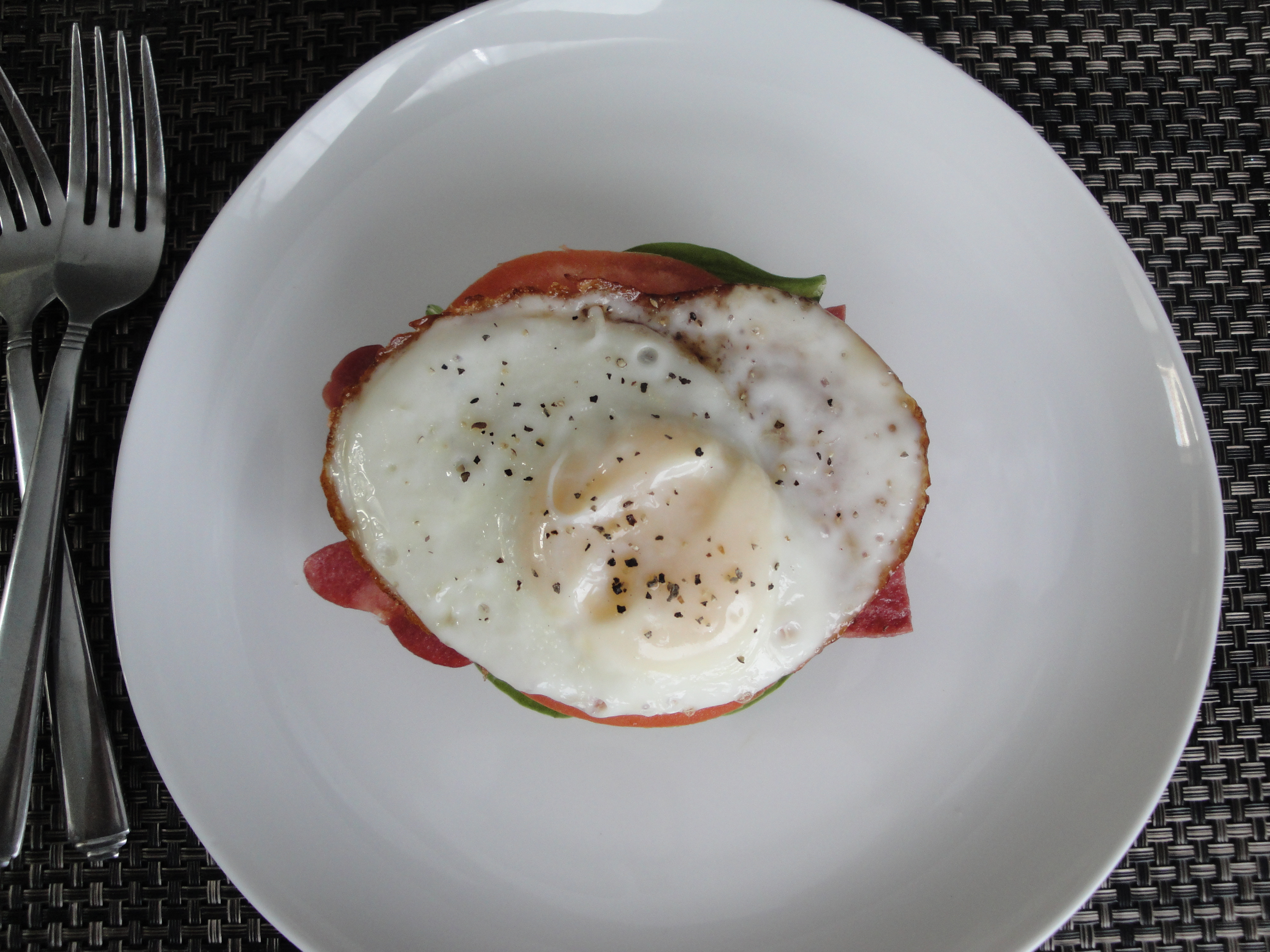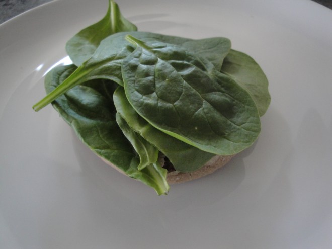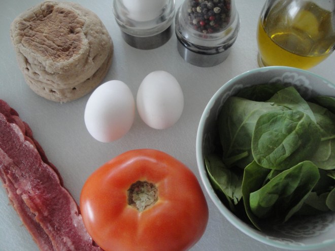 Toasted bread is topped with spinach, a tomato slice, bacon, and a fried egg.  The recipe calls for focaccia but my store was out so I substituted a whole-wheat English muffin.  I’m sure the focaccia adds a bit of pizzazz but really any kind of bread will do.  I also used the spinach instead of arugula but only because I had spinach on hand.  If you don’t like arugula’s peppery flavor, any leafy green will be a good substitute.  Eaten open faced, this sandwich is good for breakfast, lunch, or dinner and is especially perfect for a light bite.  I’m now proud to say that I am officially a BLT eater.  Or an EBLT eater.  Whatever.