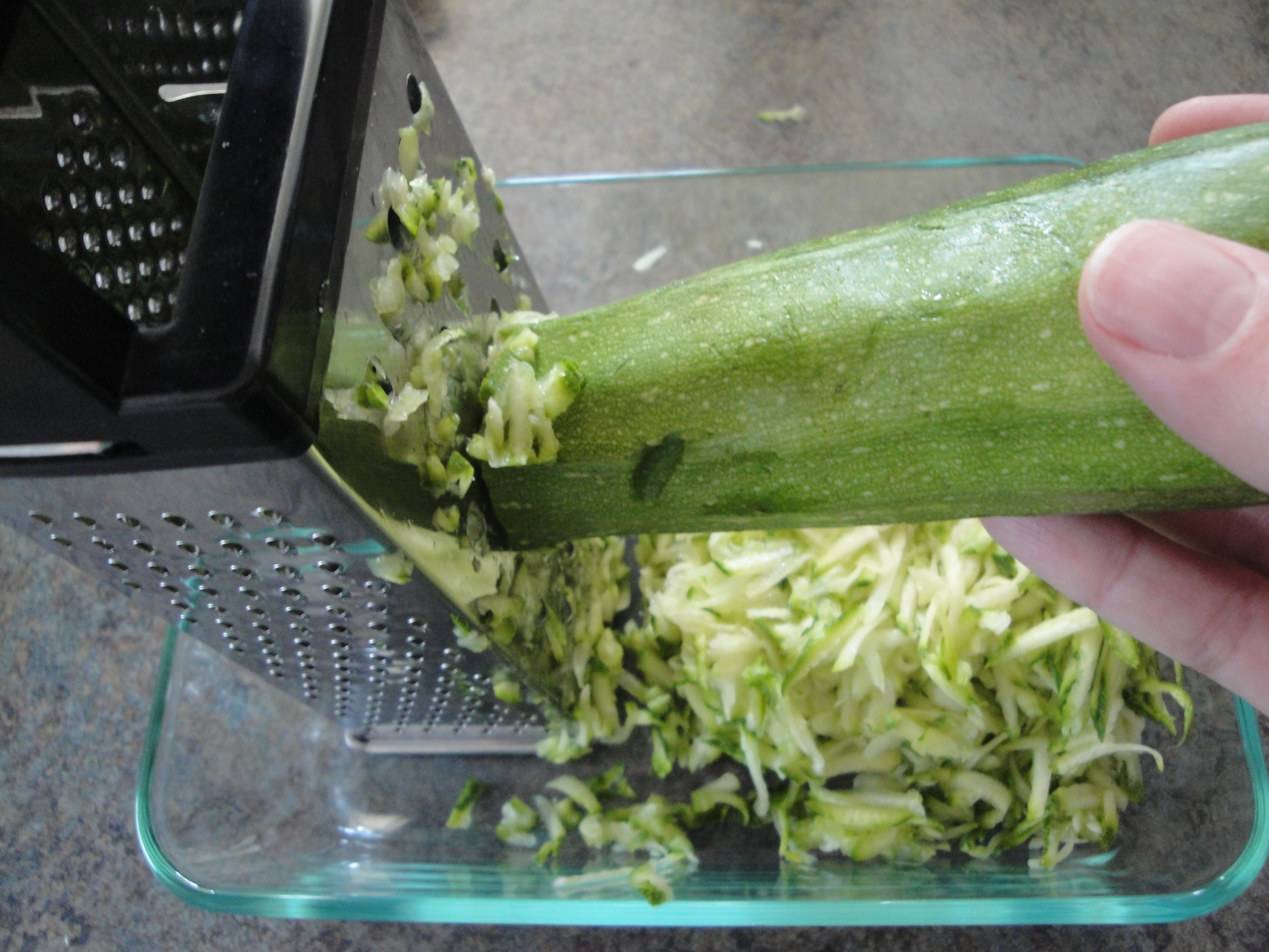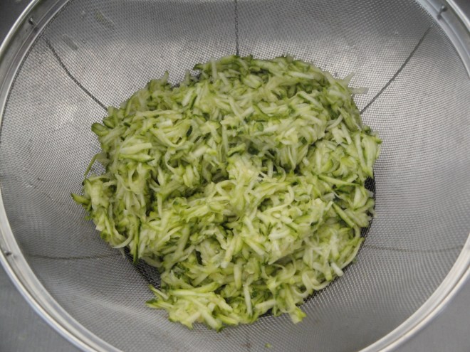 Grate the zucchini and drain in a colander with salt for 10 minutes. Remove from the colander and gently squeeze out any remaining moisture with a paper towel or clean towel.