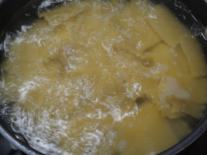 While zucchini is sitting, break lasagna into piece and cook in boiling water according for 12 minutes. Be sure to reserve 1/2 cup of the cooking water before draining the pasta.