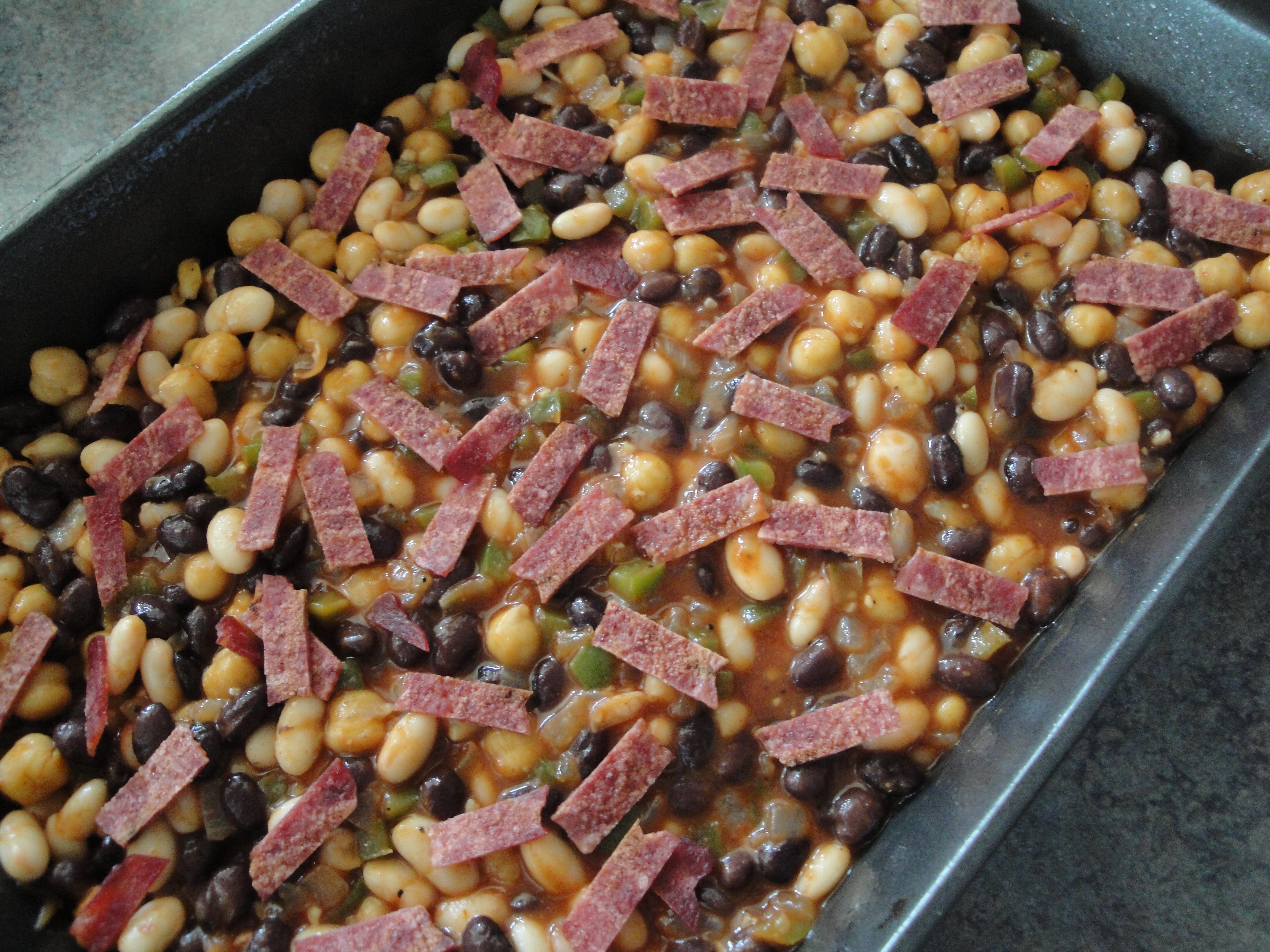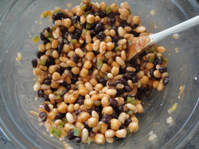 Add onion/pepper mixture and all of the beans to the sauce mixture.