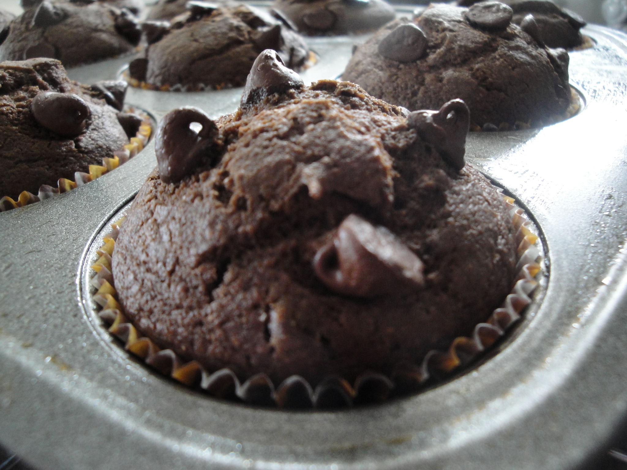 A simple muffin batter is jazzed up with a splash of red wine vinegar and chocolate chips, which are also used to top of these puffy cocoa gems. I used regular chocolate chips in place of mini-chocolate chips because I had them on hand but I can only imagine how rich and chocolatey these muffins would be with little bits of melted chocolate in every bite. These muffins satisfy any chocolate urge you get and are perfectly light enough to eat with your morning coffee. Now I can actually feel a little less guilty about eating chocolate for breakfast.