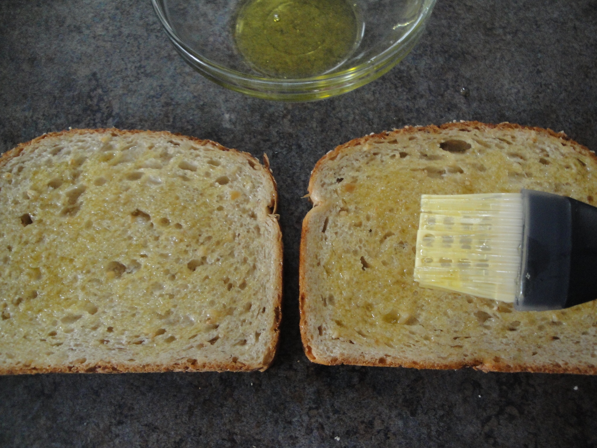 Brush olive oil onto one side of each bread slice and rub garlic over oil.