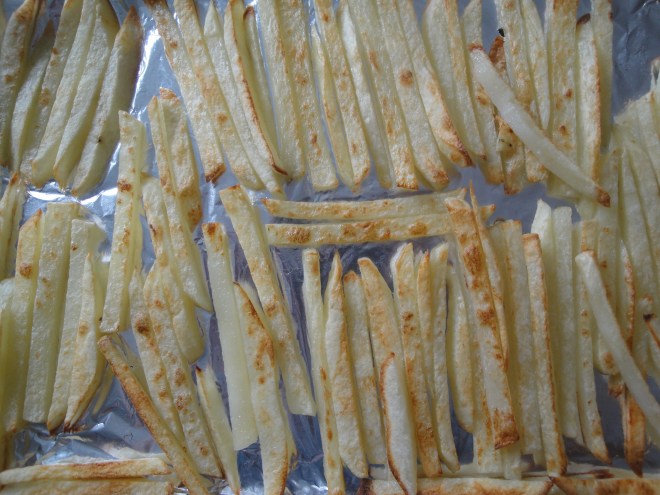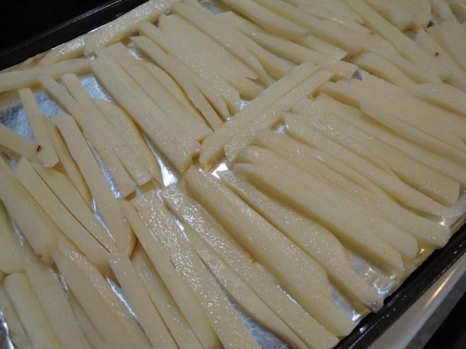 Arrange potato sticks in pan (in a single layer if possible) and bake at 450°F for 5 minutes. Turn oven to broil and broil for 20 minutes or until browned, turning once.