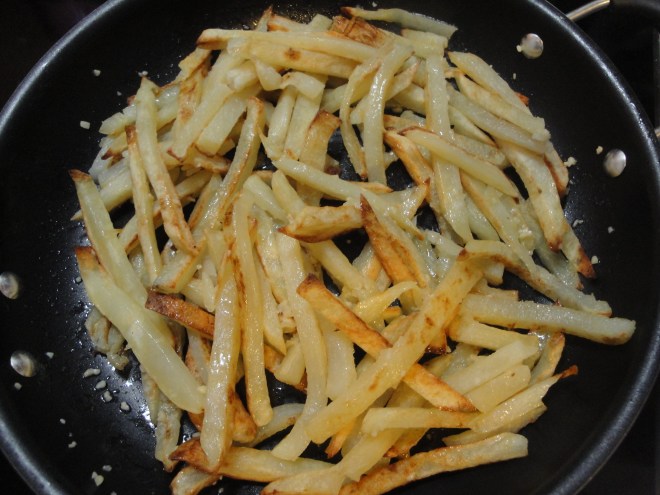 Add fries to butter-garlic mixture and cook for 1 minute.