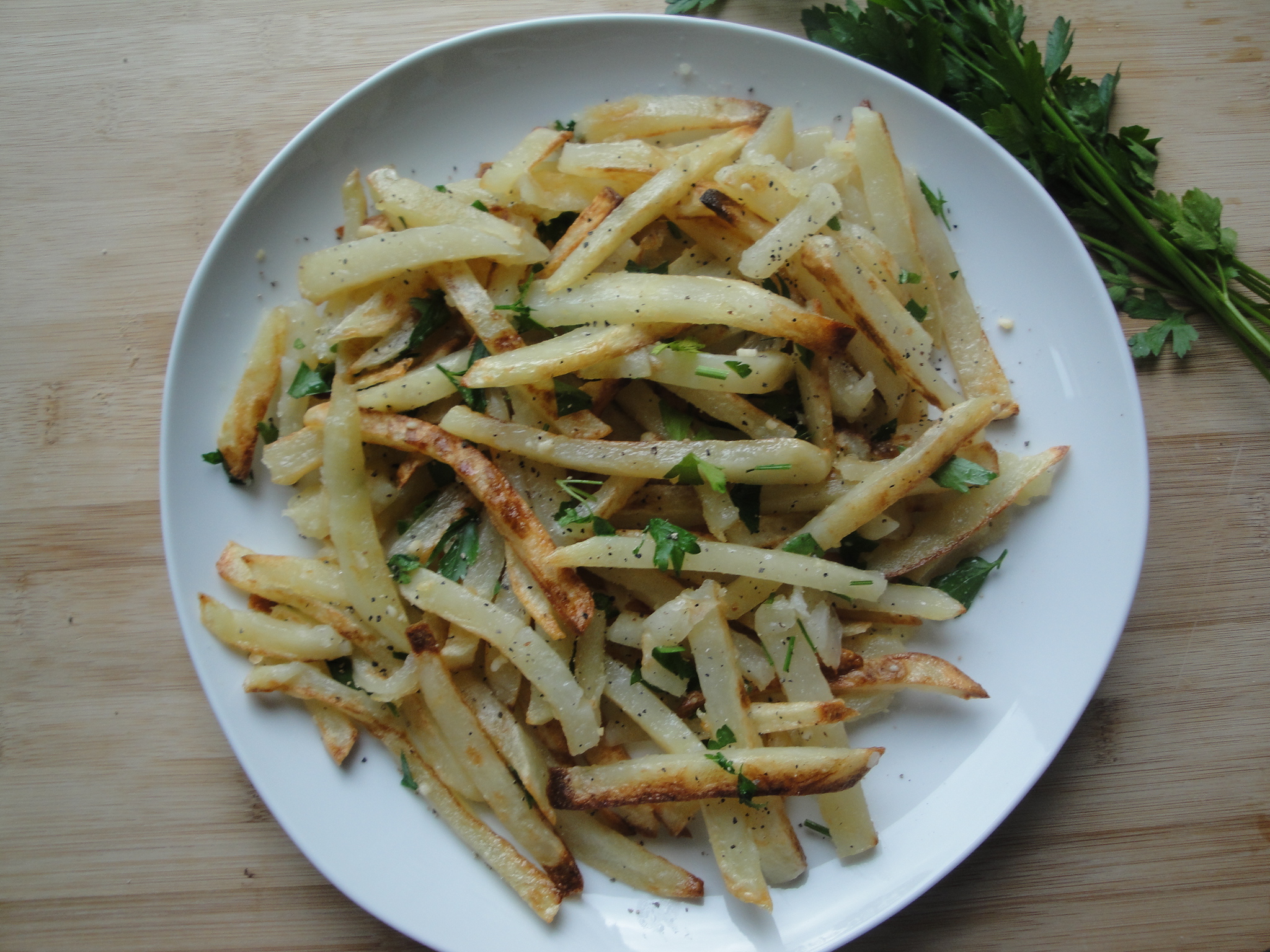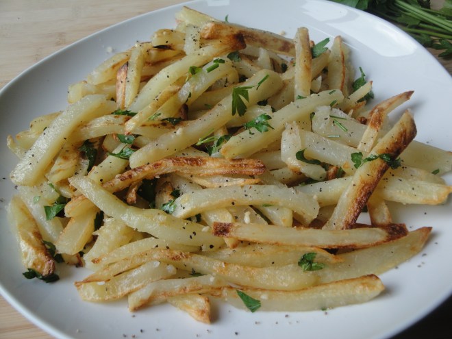 Plain baking potatoes are cut into matchsticks and baked in the oven with nothing but a little canola oil. After baking, they are tossed with melted butter, garlic and fresh parsley. Easy peasy. The longest part of this process is cutting the potatoes into fries. Be patient. I put the matchstick potatoes in a bowl of water to keep them fresh as I cut the rest. I also recommend spraying the pan with non-stick spray because despite the canola oil, many of my fries still stuck. And while these fries aren’t crispy the way restaurant fries are (duh, because they aren’t fried), I still devoured these. Like I said, I love fries. Even bad fries. Not that these were bad. If you are going to make fries at home, this is a good way to go. But if it’s faster or you prefer to order fries in, do it. I won’t judge. I know what it means to have a fry fix.