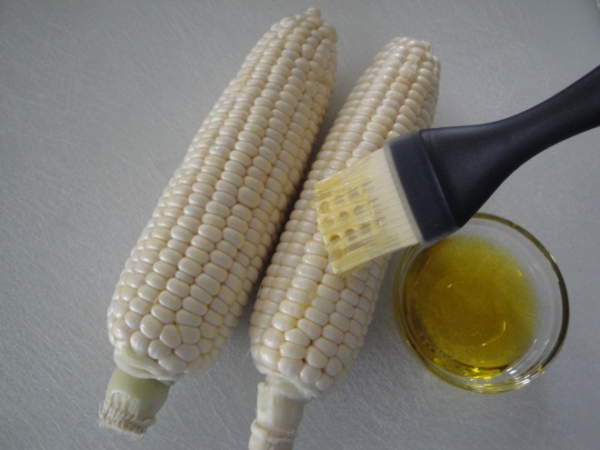 Brush corn with 2 teaspoons of olive oil and grill corn 12 minutes or until beginning to brown on all sides, turning occasionally.