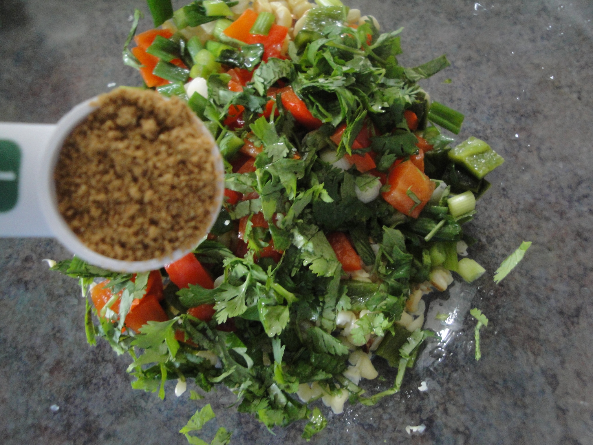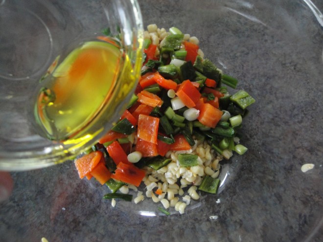 Chop onion, bell pepper, and poblano and add to the bowl with corn.
