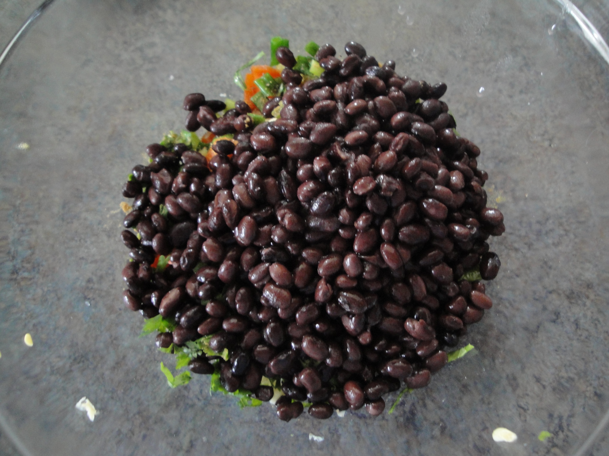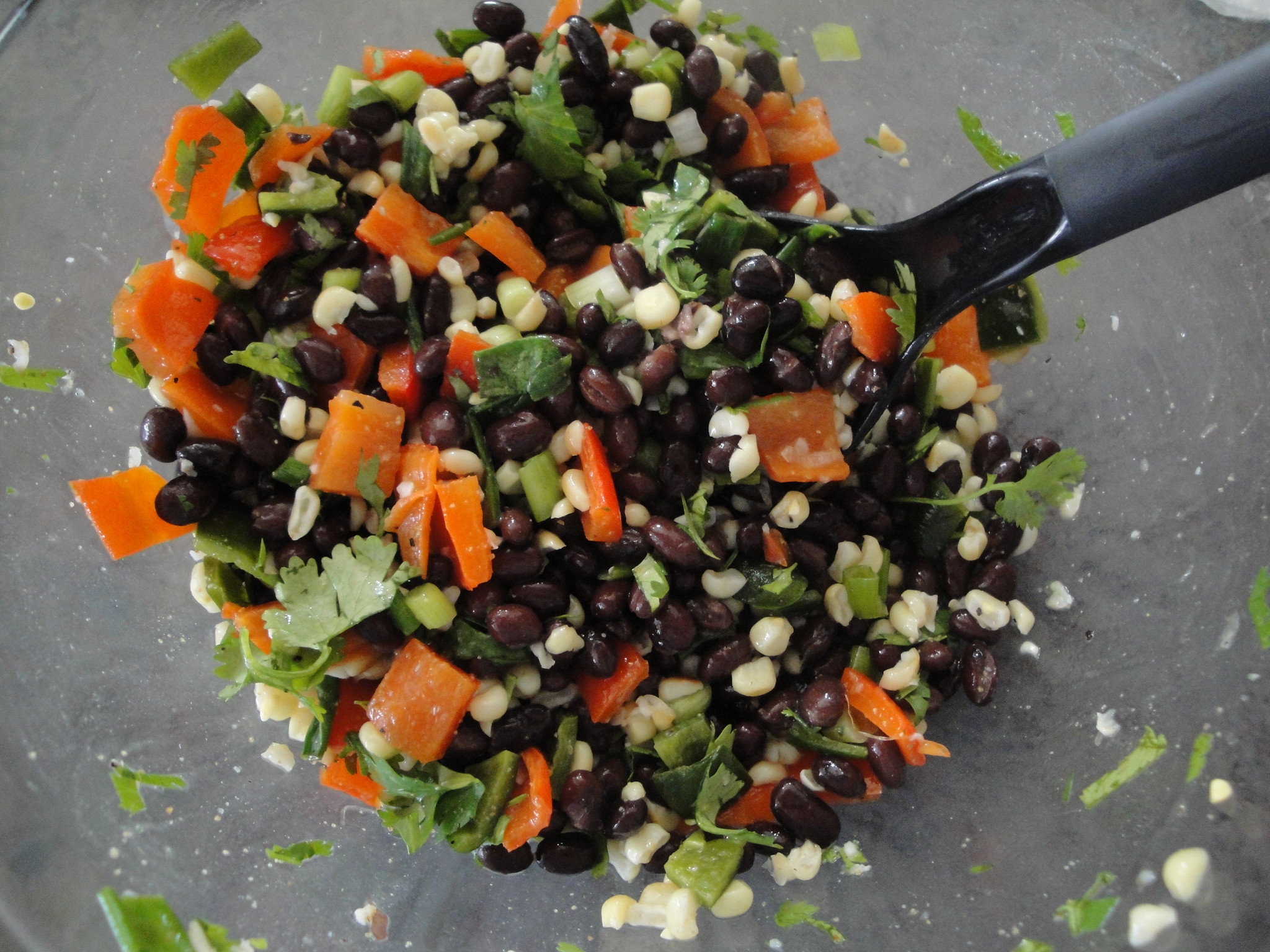 Add remaining olive oil, cilantro, lime juice, ground cumin, salt, black pepper, and black beans to bowl. Toss well.