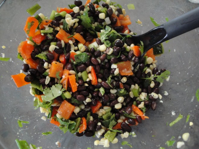 I’ve been noticing how few vegetables have been making their way into my kitchen lately so when I went to the store early on Saturday morning, I spent a lot of time in the produce section, picking up zucchini, squash, peppers, oranges, corn, avocado, and tomato amongst others. I’m trying to make a deal with myself that I won’t eat anything unless it has a fruit or veggie in it or with it. Not a bad way to live, I assume. This means that if I splurge on an egg sandwich in the morning, I have to be prepared to bring in a baggie of spinach to put on it or at least pick up a piece of fruit to eat with it. It doesn’t help that I can’t stop watching the Olympics and seeing all of these physically fit athletes are really sending me into a self-loathing spiral. First up is Grilled Corn, Poblano, and Black Bean Salad which is perfect on a summer day.