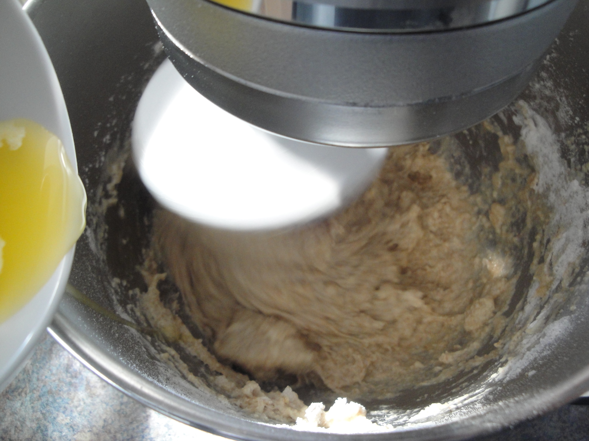 With mixer on, slowly add 1 cup milk, juice, honey, and 2 tablespoons butter; mix dough at medium speed 7 minutes or until smooth and elastic.
