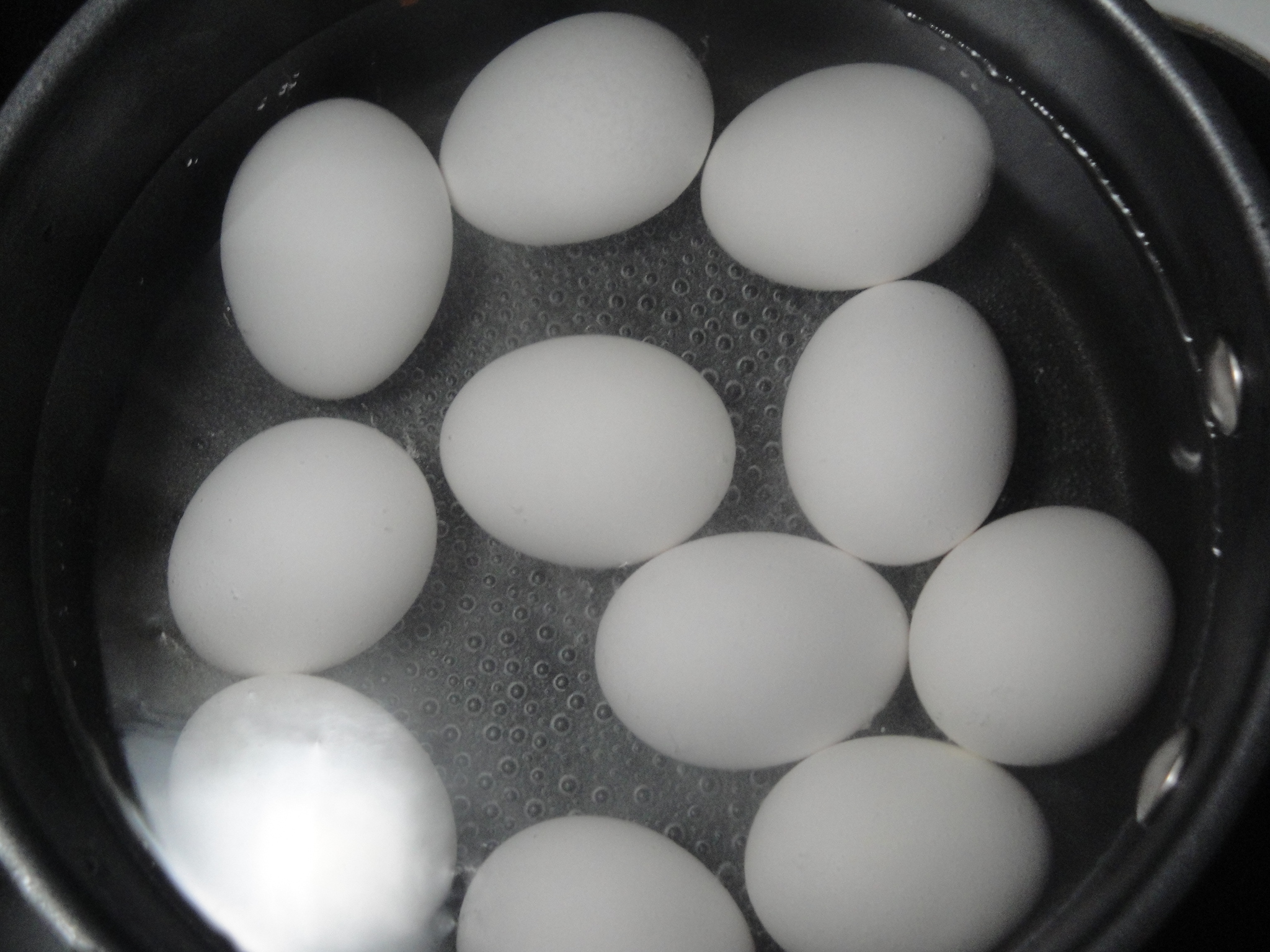 Place eggs in a large pot and cover with water. Bring to a boil, cover, and let sit for 15 minutes.