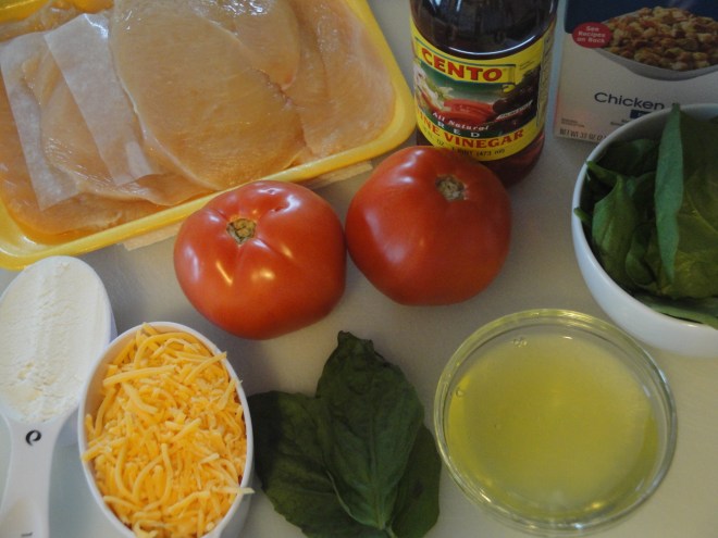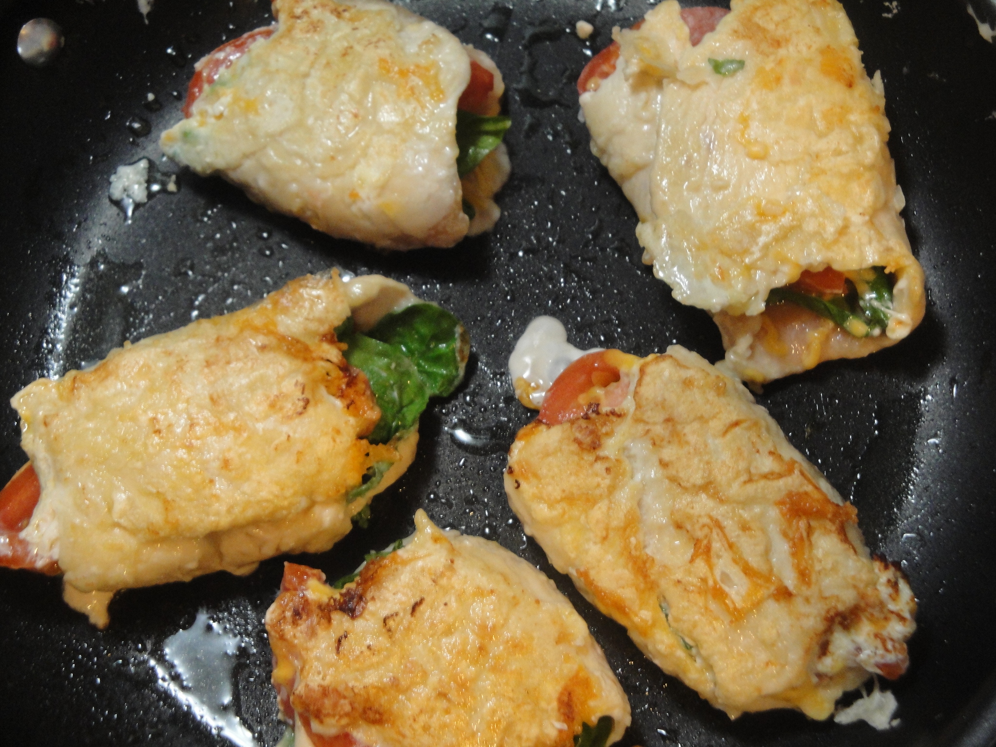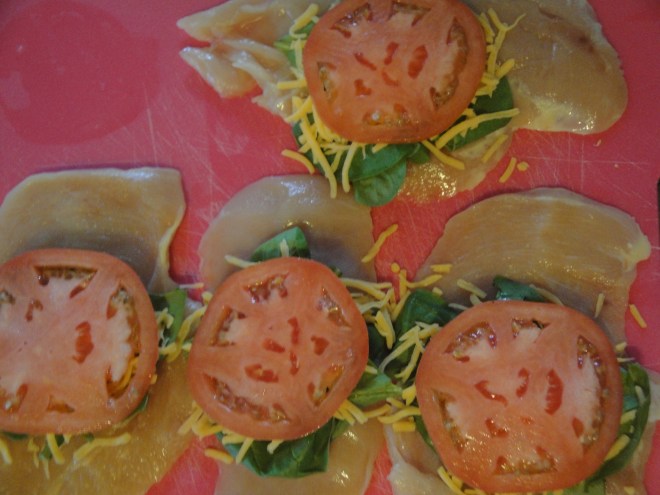 Place thin chicken breasts on work surface, smooth side down. Top with 1∕4 cup of the spinach, 1∕4 cup of the cheese, and 1 tomato slice.