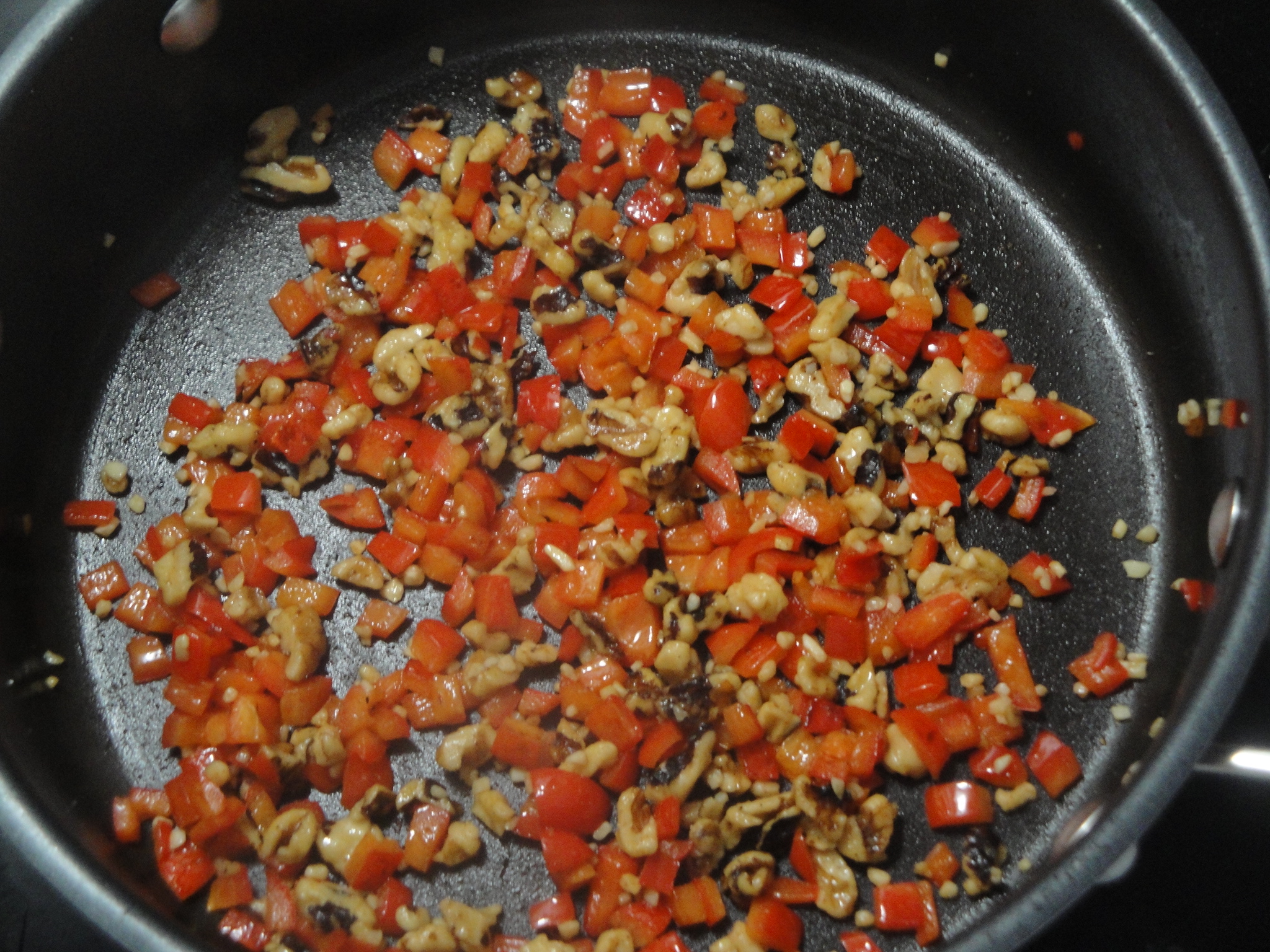 Heat olive oil in a large skillet over medium-high heat. Add bell pepper; sauté 2 minutes. Add walnuts, salt, and garlic; sauté 2 minutes. Stir in remaining oil and lemon juice.