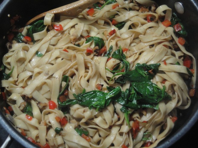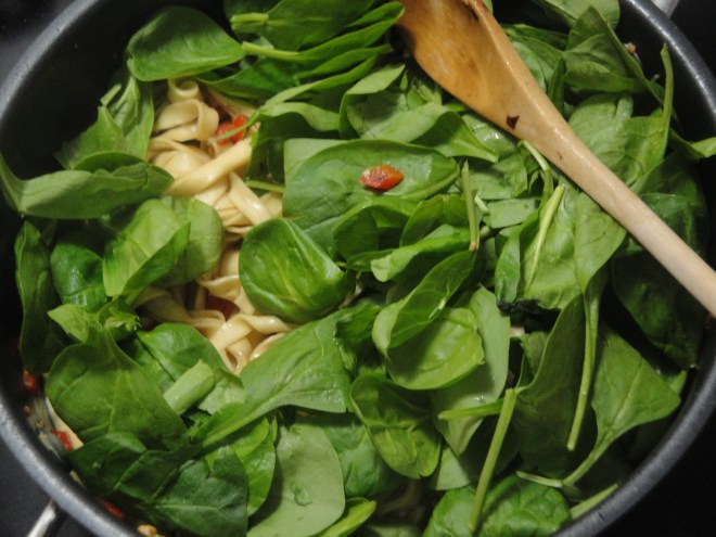 Add pasta, pasta water, and spinach; cook 1 minute or until spinach wilts.