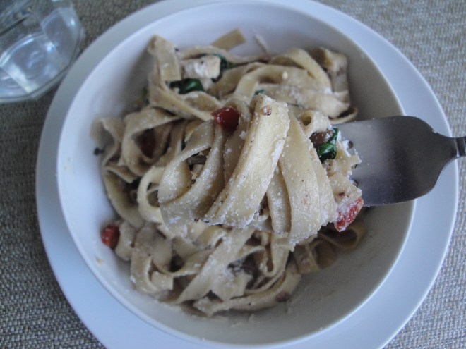 Fettuccine is tossed with sautéed red peppers, chopped walnuts and spinach before being topped with lemon-flavored ricotta cheese. The walnuts, which I love, give the dish a crunch which is interesting with the pasta. The ricotta provides a creamy element and the lemon provides a fresh brightness. The is a light pasta dish that I liked but thought was missing something. I ate all of it, so it was good enough to me. But I kept thinking that a splash of balsamic vinegar would bring it to life. If you try this, let me know what you think.