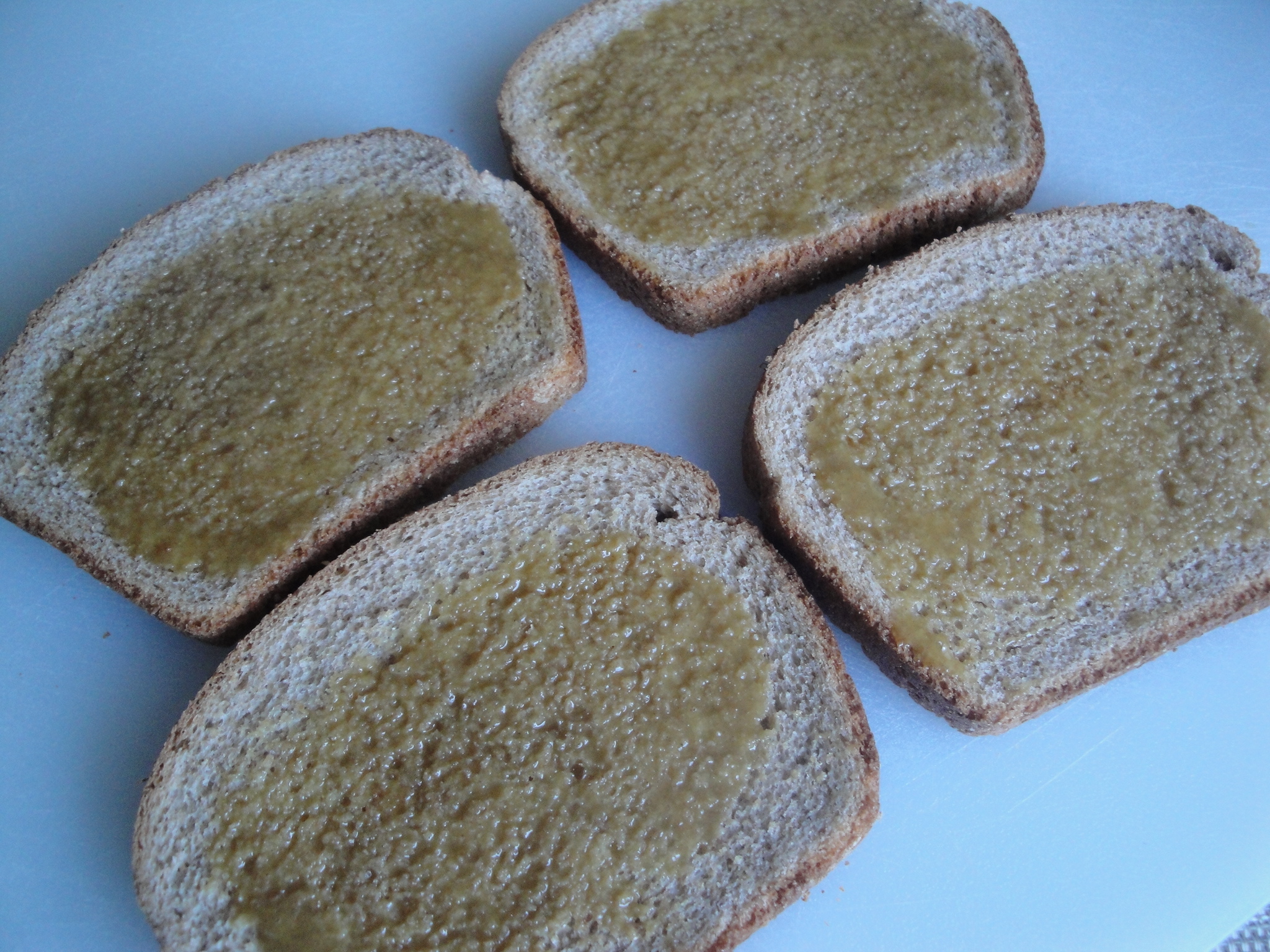 Combine mustard and honey in a small bowl. Spread one side of each of 4 bread slices with 1 1/2 teaspoons mustard mixture.