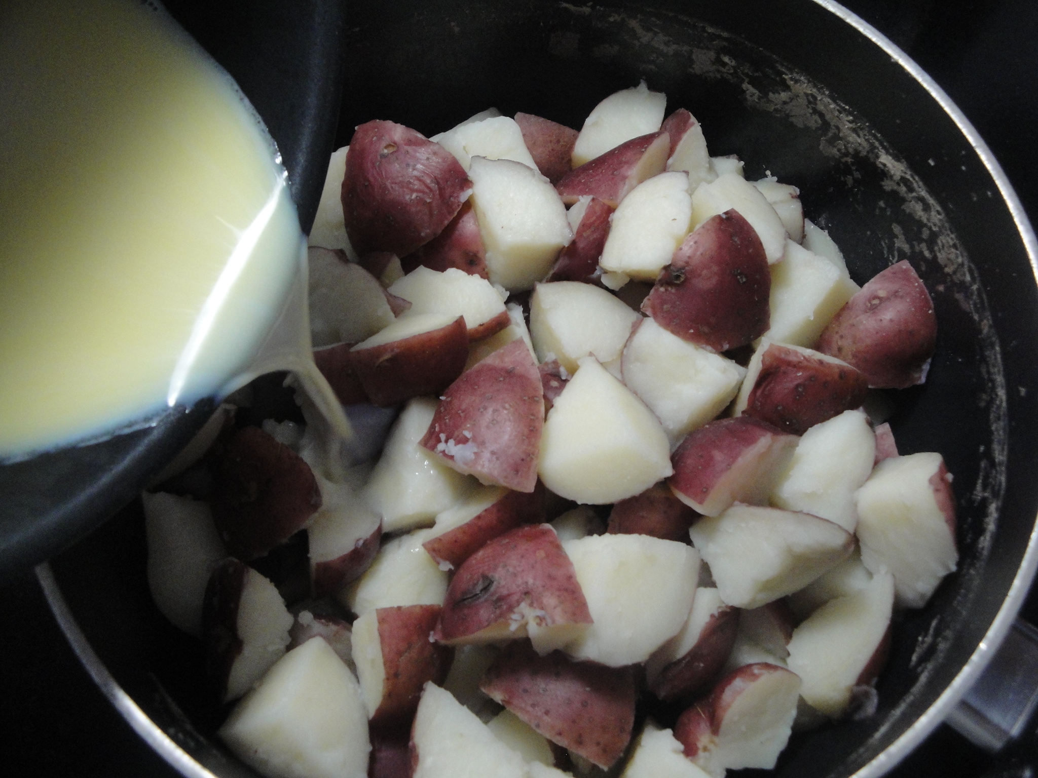 Drain potatoes well and return to pot.  Add milk mixture, 1/2 teaspoon  salt, and 1/8 teaspoon freshly ground black pepper.  With potato masher, mash until smooth.