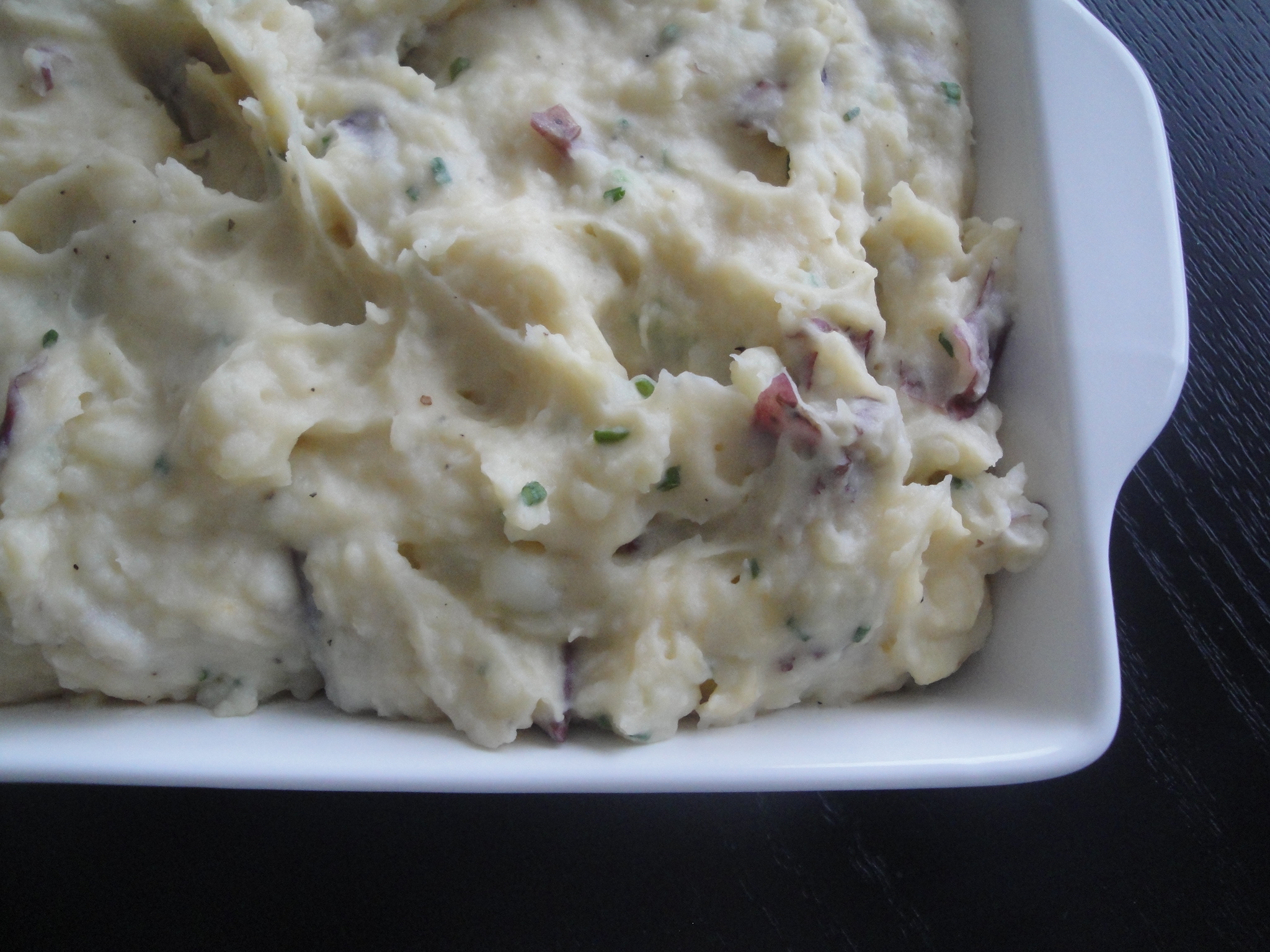 Red potatoes are cooked until perfectly soft and coated in a warm milk, butter and garlic bath before being hand mashed until creamy and still slightly lumpy.  Cheddar cheese, chives and sour cream are added to make these potatoes even more decadent, fluffy and flavorful.  The worse part about making mashed potatoes to me is the pealing but this recipe keeps the skin on so that painful process is eliminated (although you do still have to scrub them).  This recipe made a TON of potatoes which I barely made a dent into and still sadly have in my fridge.  These would make for great base for potato pancakes or just as a side to a good ol’ chicken dinner.  Winner winner.