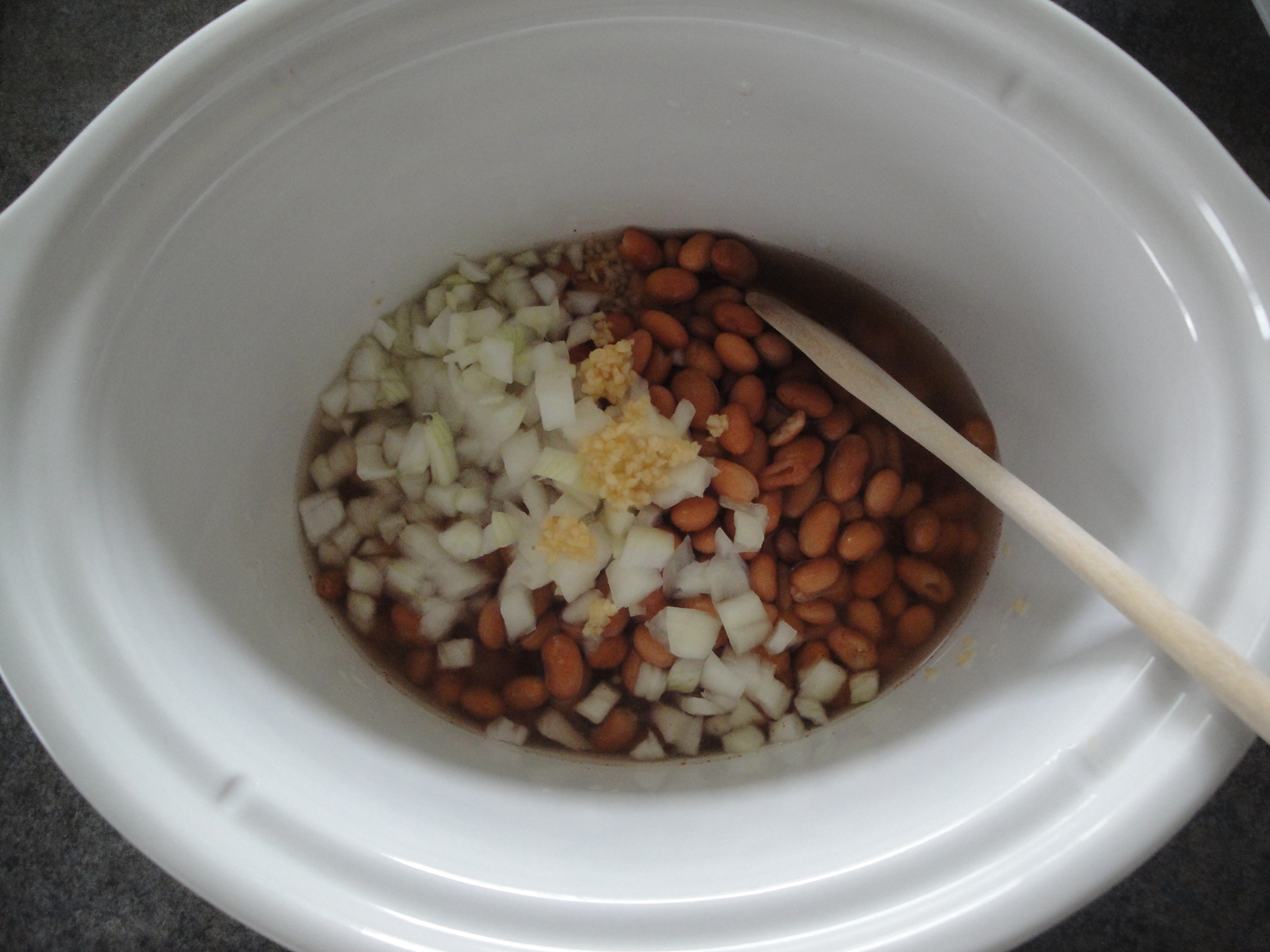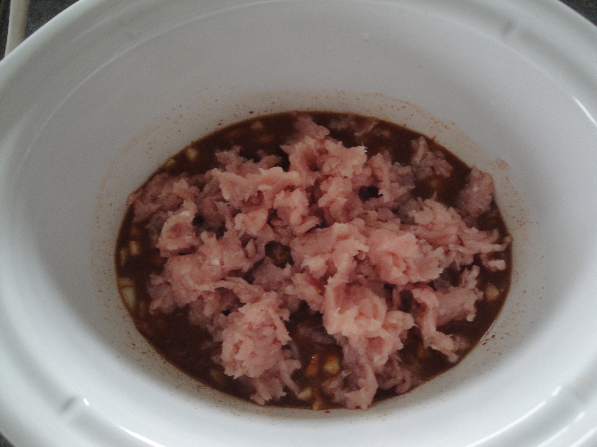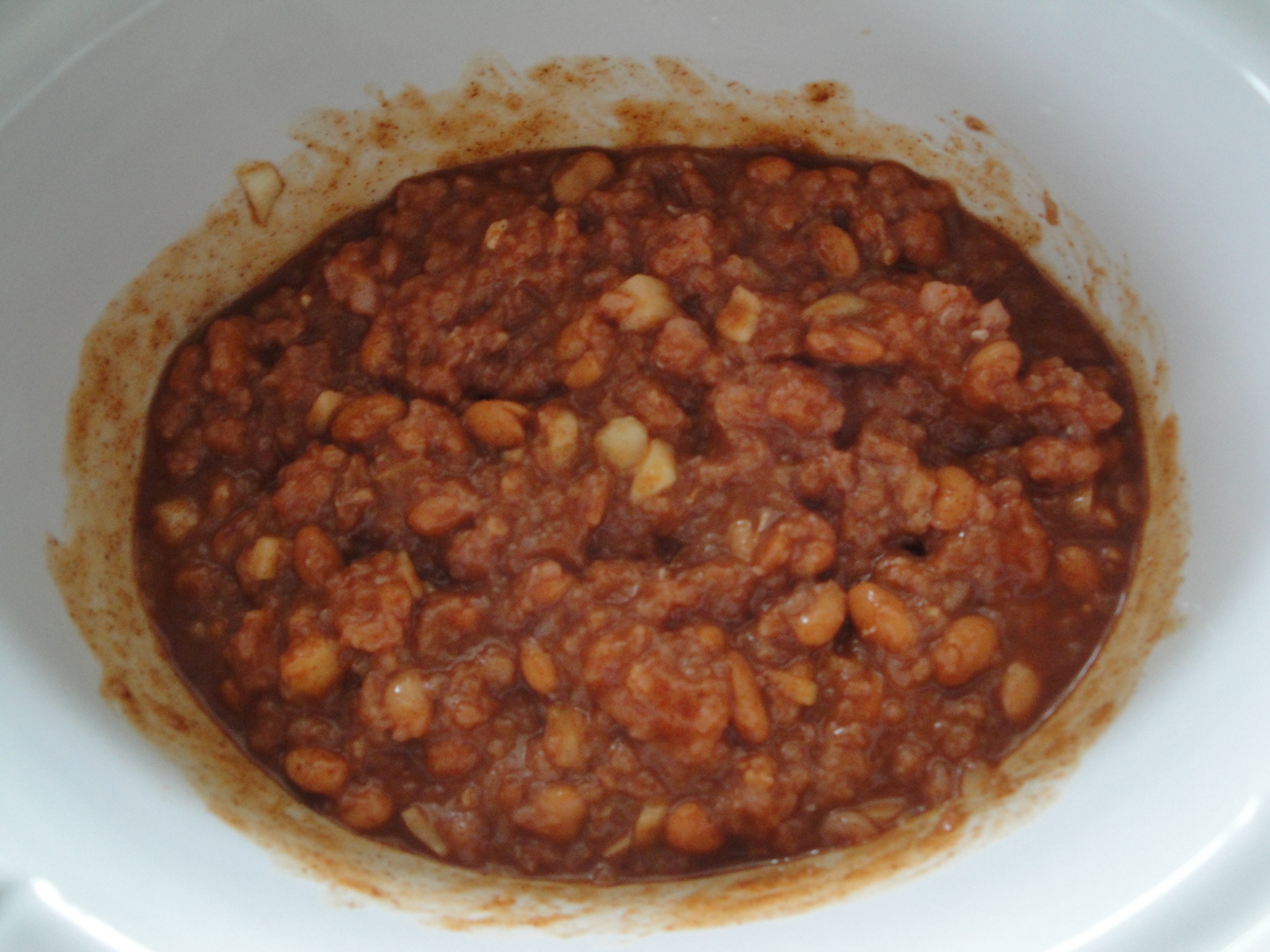 Pour ketchup mixture into slow cooker and stir in 1 cup water, beans, onion and garlic. Crumble in half the turkey and gently stir to combine. Repeat with remaining turkey.