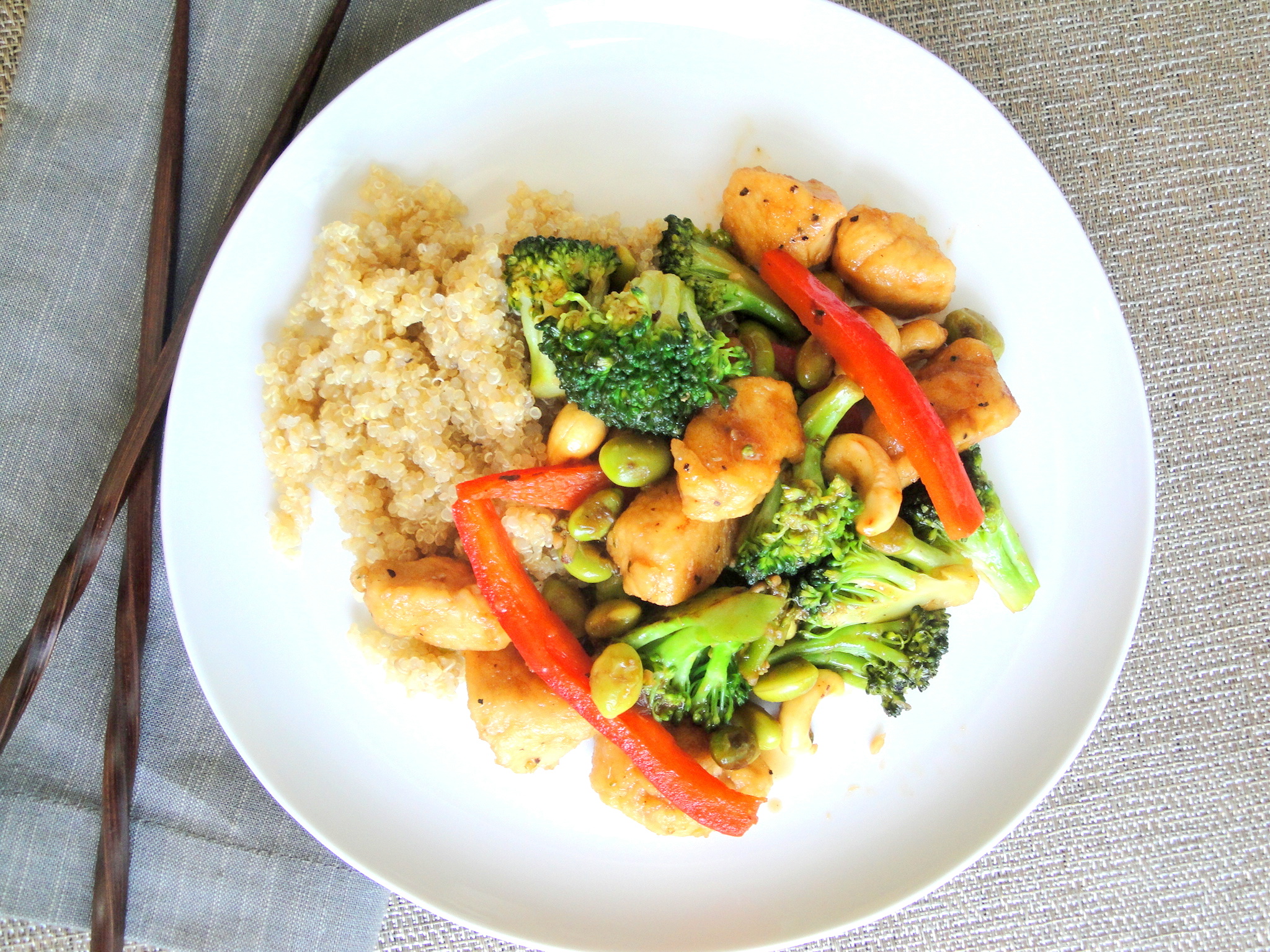 Bite-sized pieces of chicken are tossed in a light coating of cornstarch and cooked in a hot skillet with canola and sesame oil.  Fresh broccoli, red pepper and edamame are added and stir-fried until perfectly crisp before being mixed with cashews and a perfect concoction of soy sauce, honey and sriracha.  Served with a side of brown rice or quinoa, this will be a meal I will make again and again.