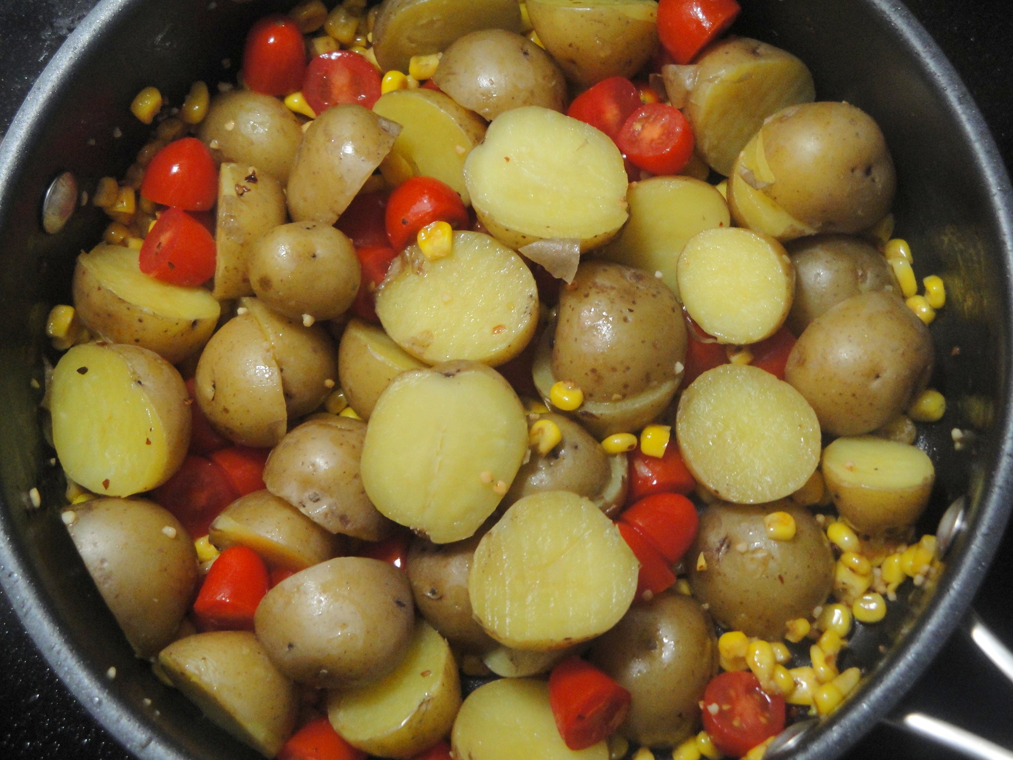 Memorial Day weekend is finally here and even though it’s rainy here in the Northeast, I’ll happily take the extra day off to chill out, relax and widdle away the stresses of working life. While I don’t have any real plans for the weekend, hopefully some of you are getting out there and enjoying yourselves, either at the beach, the park, the lake or wherever it is that you love to go most. We’re entering the season of grilling and cookouts so for the unofficial start of summer I’m giving you Baby Potatoes with Tomato-Corn Sauté.