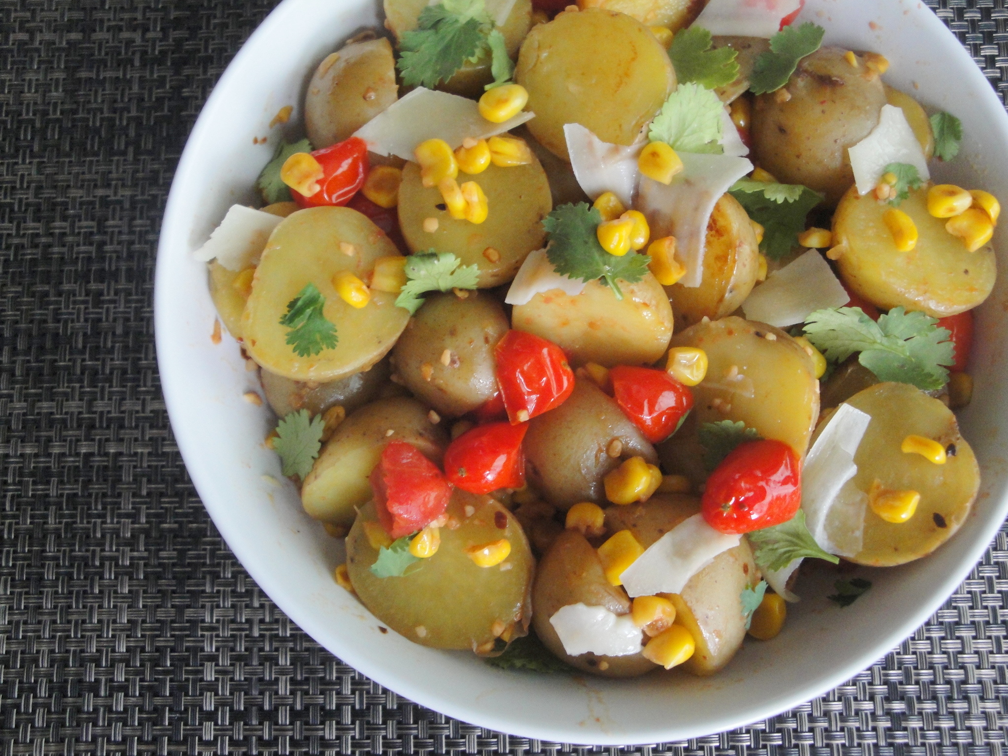 Baby potatoes are mixed with olive oil, corn, grape tomatoes and garlic to give you a simple sort-of potato salad that travels well and can be eaten hot or cold. No mayonnaise means no worrying about taking this dish to an outdoor event and with summer corn and bright tomatoes, what a better dish to kick off the summer. Topped with fresh cilantro and salty parmesan cheese, these potatoes get the slightest kick from red pepper flake and will be a great addition to any get-together you might be attending this weekend. Get out, enjoy the weather and have yourselves a fantastic weekend!
