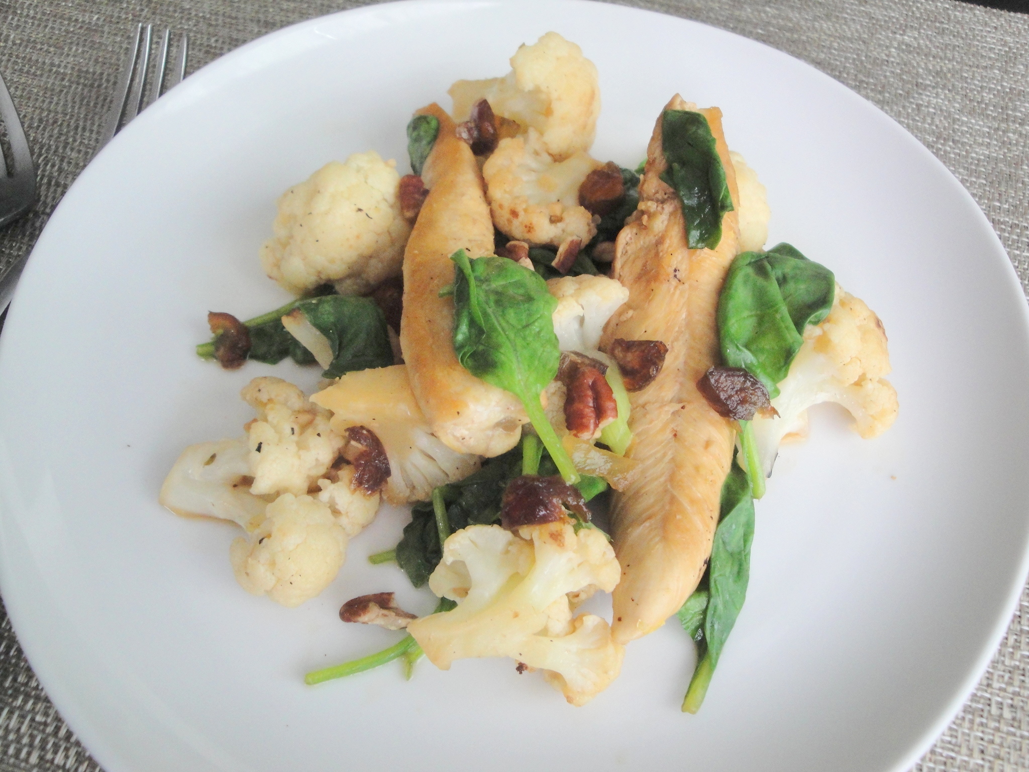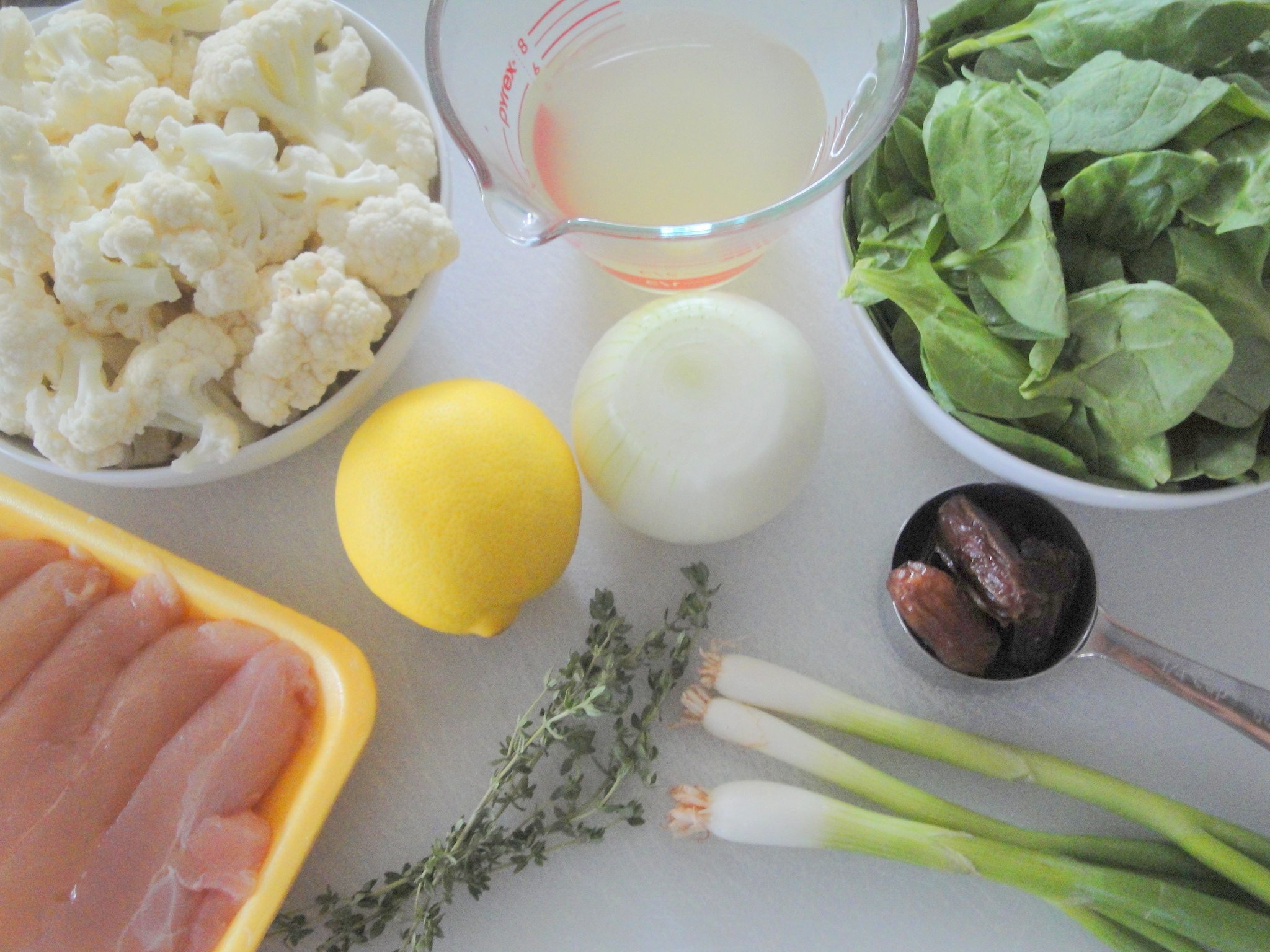 Frozen chicken tenders (yes, frozen) are mixed with onion and cauliflower before sitting in a lemon juice-chicken broth bath until mostly cooked. After finishing cooking in the oven, spinach and scallions are added as well as slightly sweet dates and nuts (I used pecans instead of pistachios). This is a truly unique mixture of flavors which all works together wonderfully. I’m shocked that I like cauliflower as much as I do considering I wouldn’t go near it as a kid. Or spinach. Or scallions. Or onions. Or dates. Hmm, who is that in the mirror looking back at me?