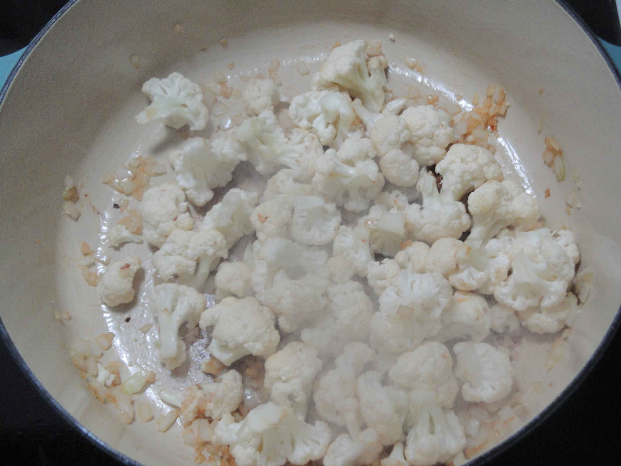 To the same Dutch oven add onion and cauliflower. Cook 2 minutes until lightly browned. Add garlic, thyme, salt, and pepper; cook 30 seconds more. Add lemon juice. Stir, scraping up brown bit in bottom of pan. Add chicken broth and lemon peel. Bring to boiling; cover and transfer to oven.