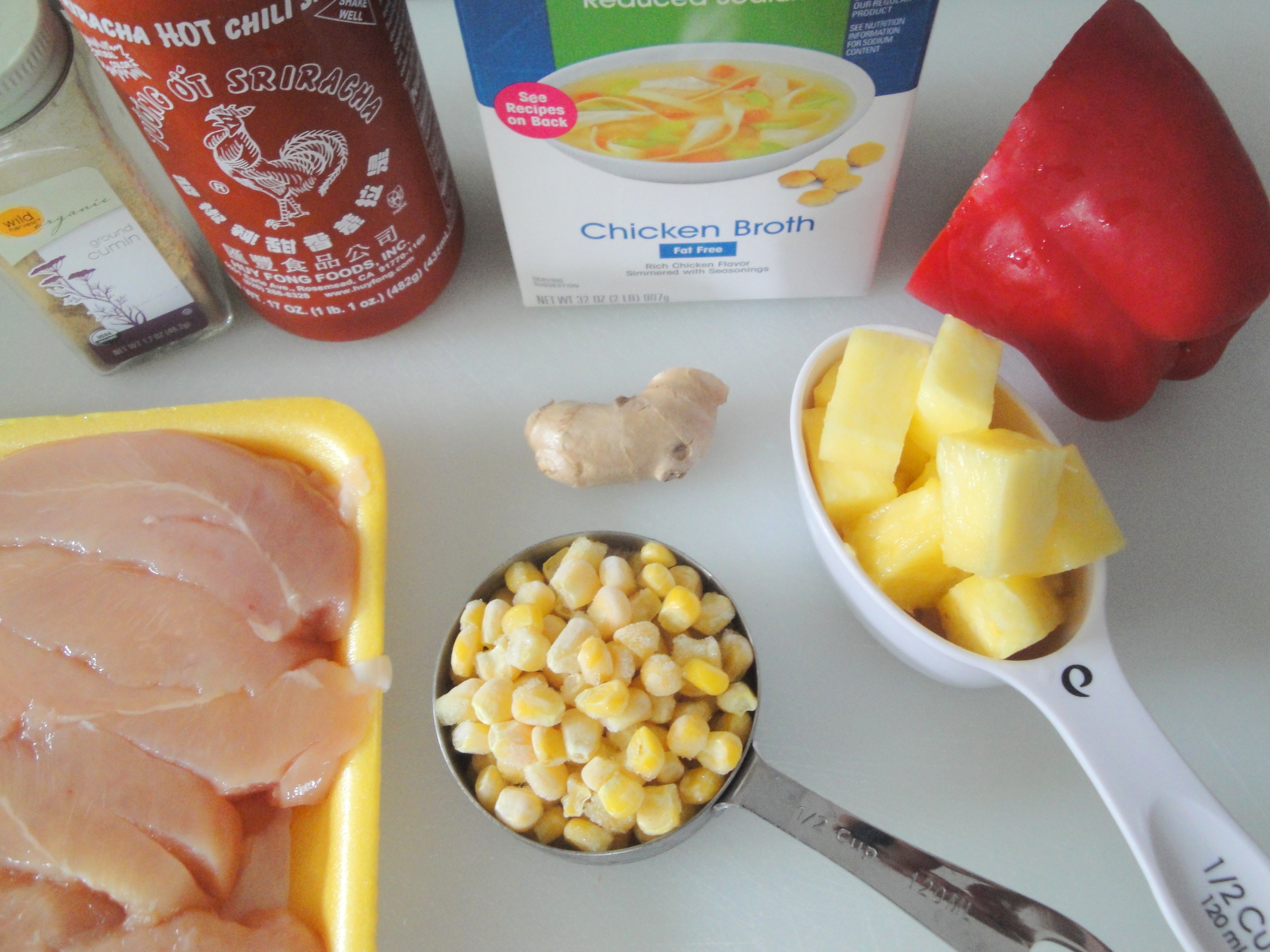 Chunks of boneless chicken breast are stir-fried with sweet corn, crispy red pepper and tangy pineapple in a flavorful sauce of ginger, cumin and chicken stock. A dash of Sriracha added at the end adds a kick to the whole dish which helps to balance out the natural sweetness of the produce. This stir-fry slightly reminds me of a healthy sweet-and-sour chicken mostly because of the juxtaposition of the sweet and spicy. It never would have occurred to me to mix these vegetable together, let alone paired with pineapple. I’ve never considered throwing together a stir-fry without any green veggies or soy sauce but now I realize that nearly any combination of fruits and vegetables could work together. Nectarine, asparagus and pea? Why not? Plum, cauliflower and spinach? Sure! My mind is officially blown.