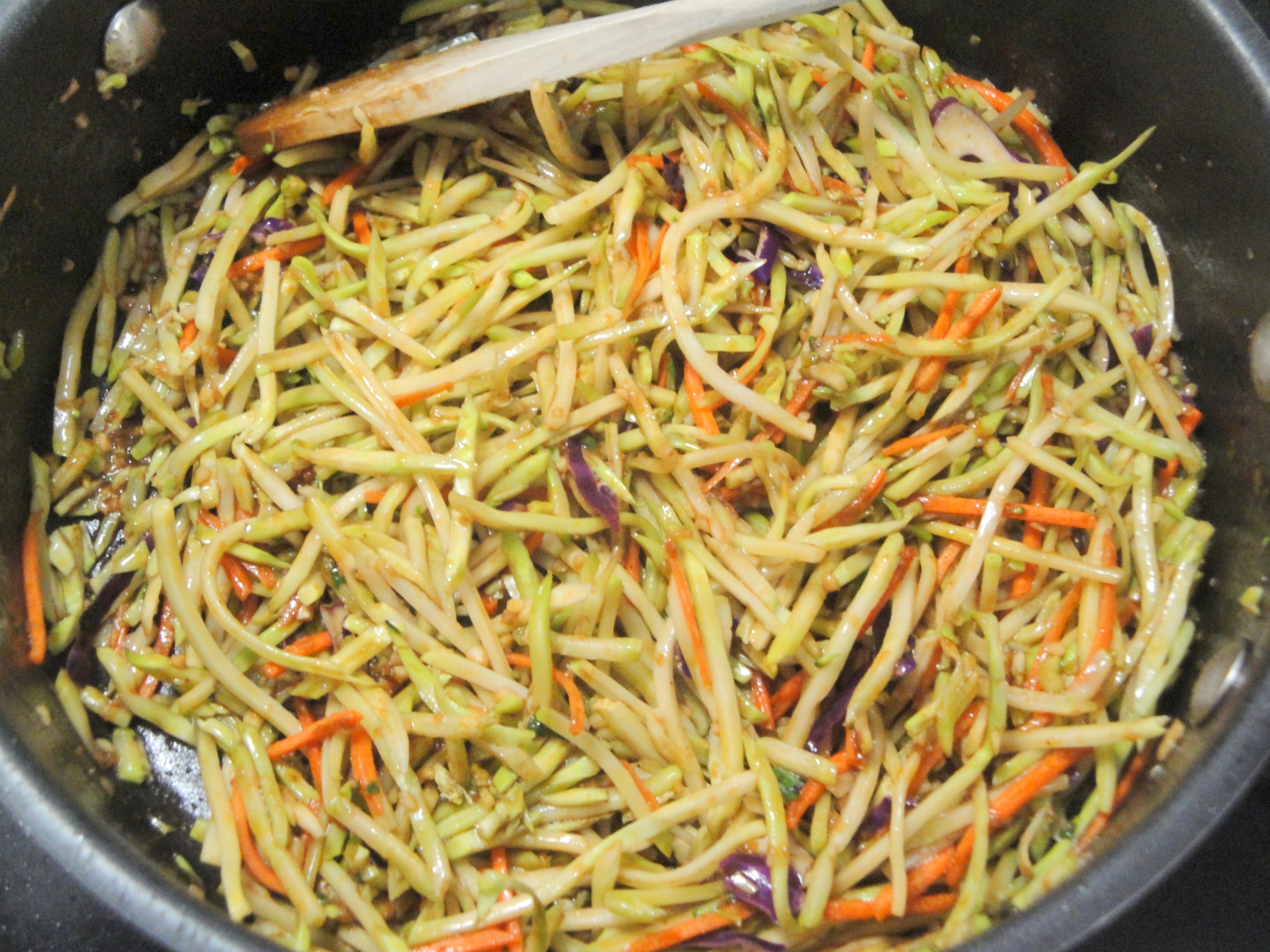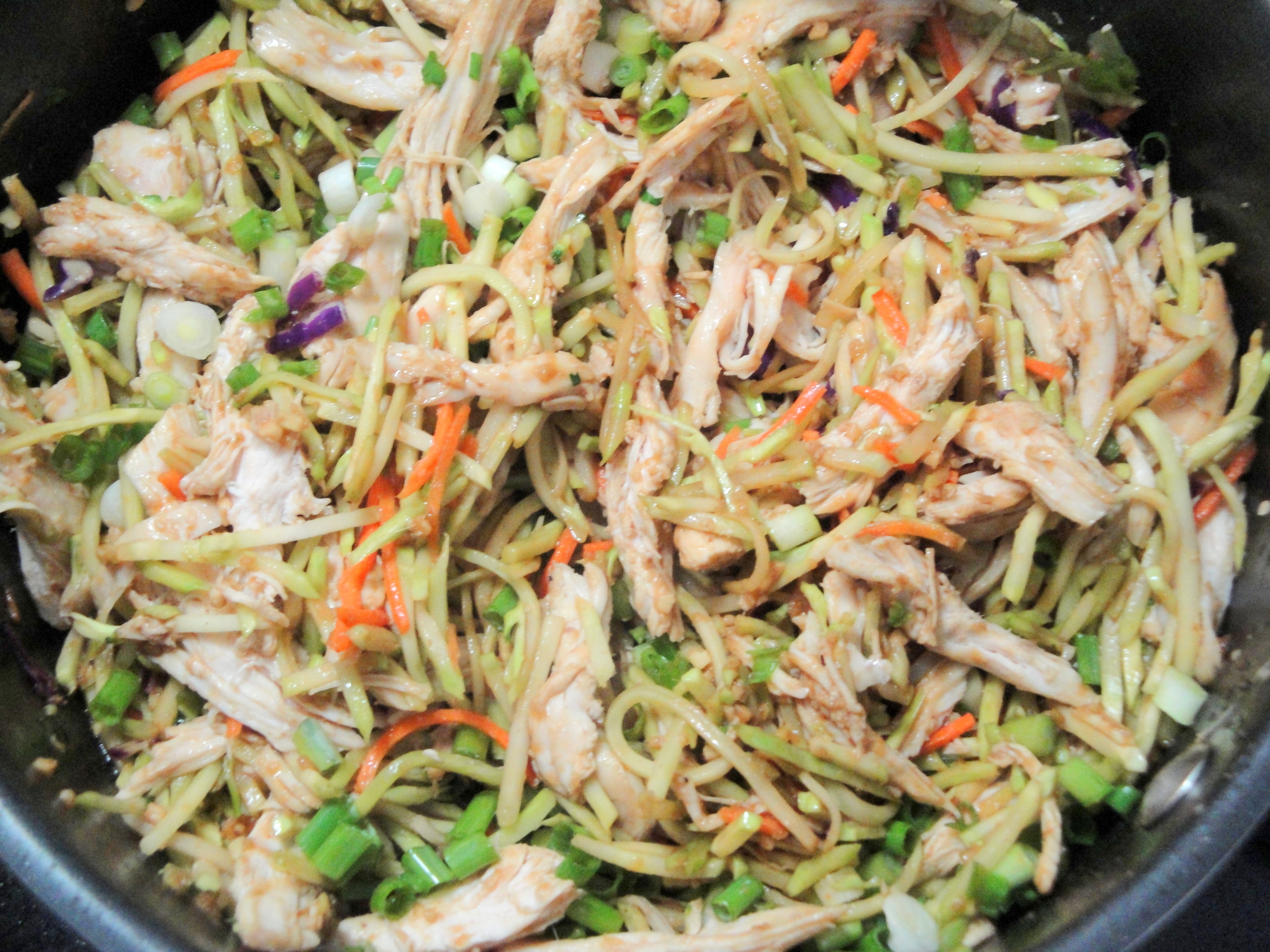 Add soy sauce mixture and coleslaw; cook 1 minute, stirring frequently. Add chicken and 1/4 cup onions to pan; cook 1 minute or until coleslaw just begins to wilt.