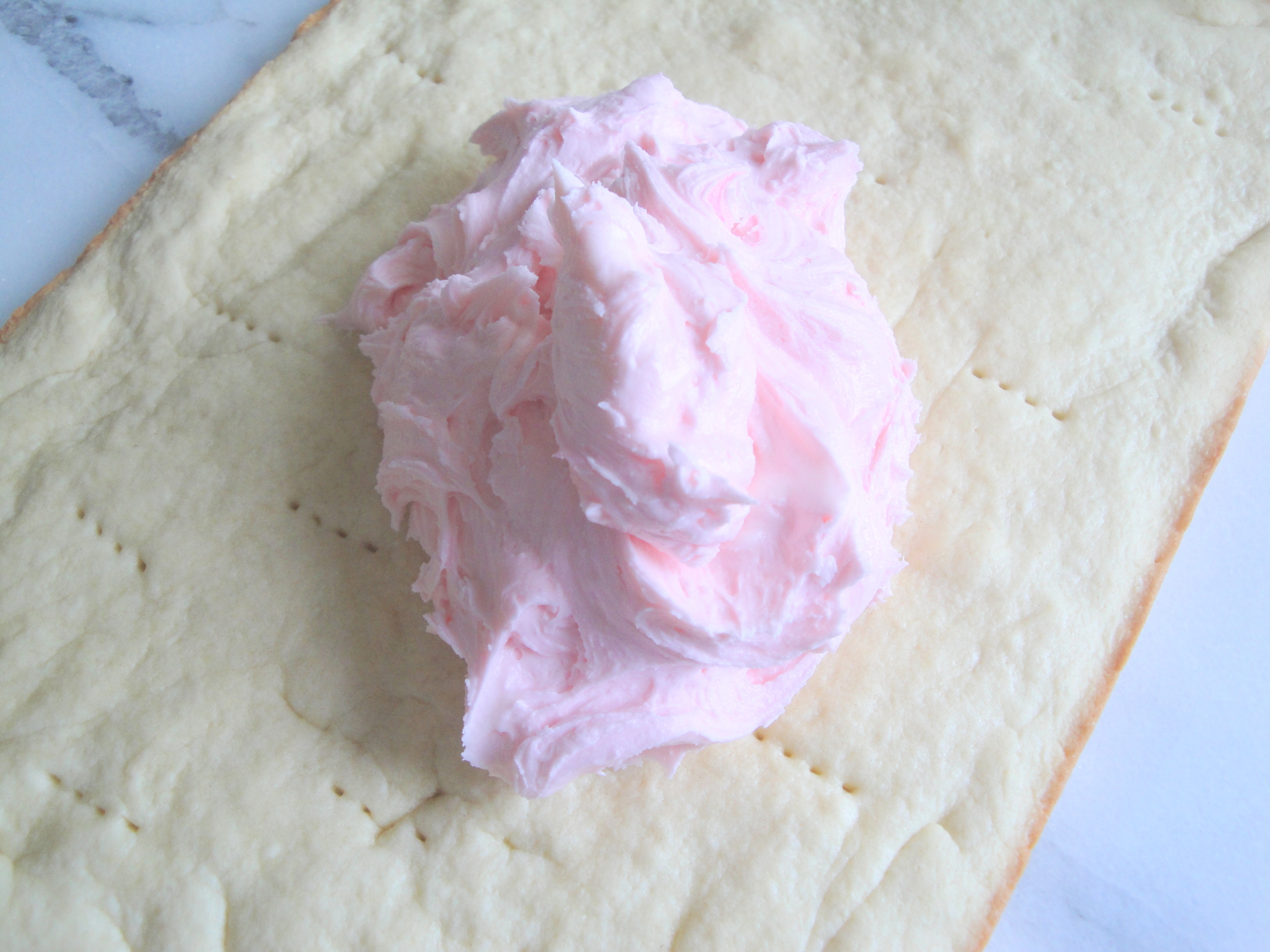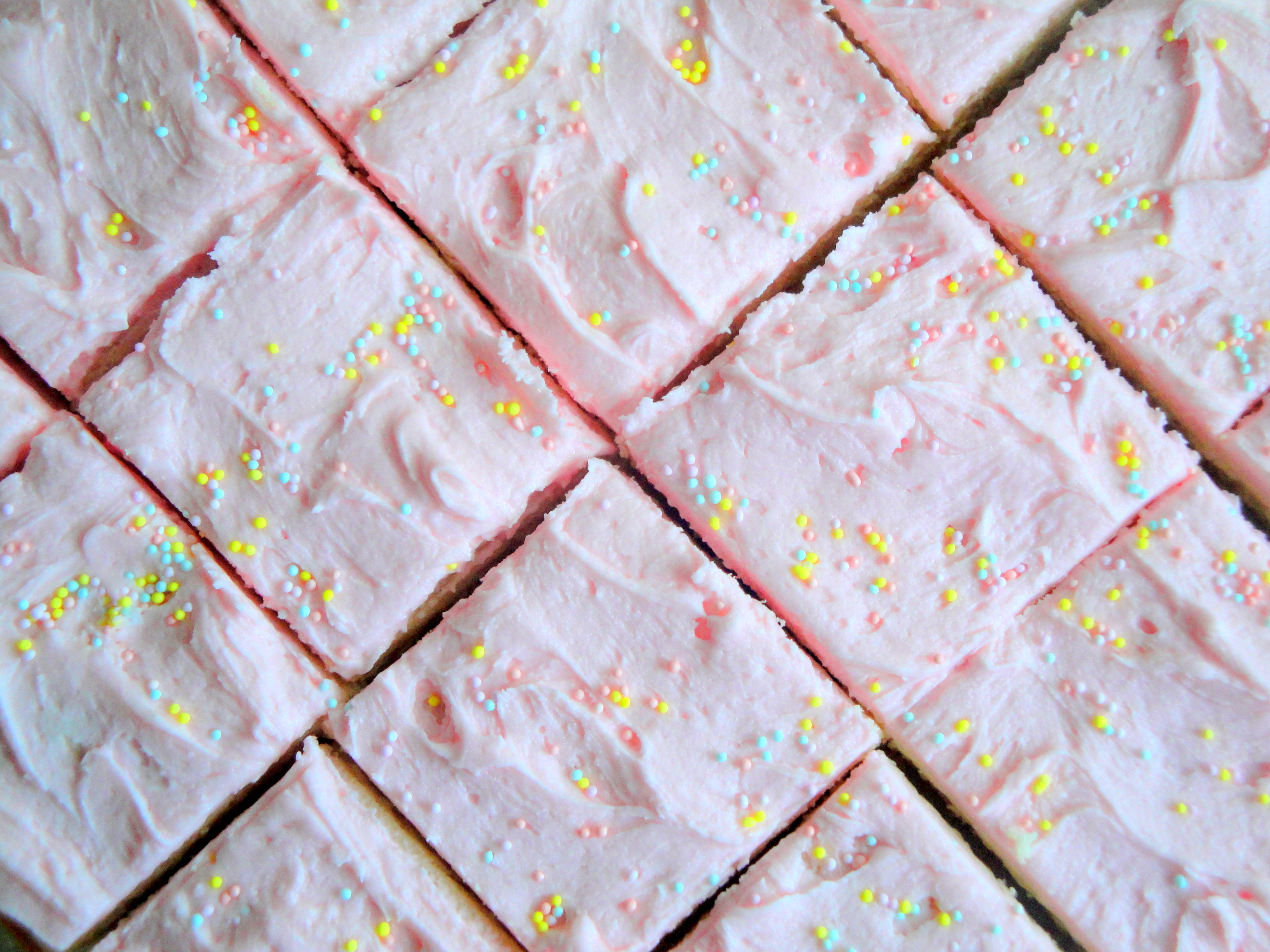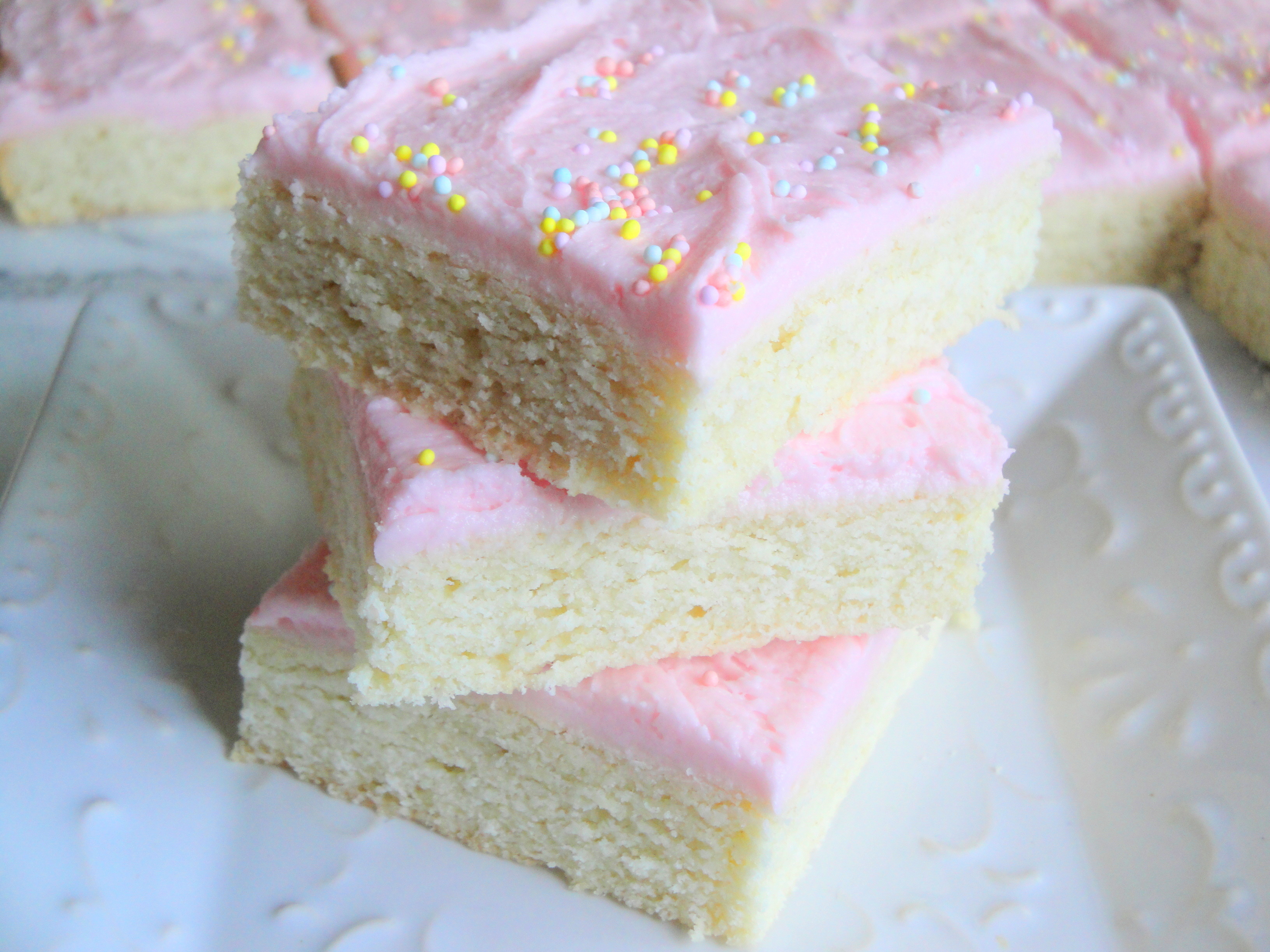 Preheat oven to 375°F. Line a 9 x 13 pan with foil and spray lightly with cooking spray, and set aside. In a large bowl or the bowl of a stand mixer, cream together the butter and sugar until light and fluffy. Add the egg and egg white, sour cream, vanilla, and almond extract, and mix until well combined. Stir in the flour, baking powder, and salt to form a crumbly dough. Press the dough into the prepared pan to form an even layer, and poke the dough every few inches with a fork so it will bake evenly. Bake 17-20 minutes or until lightly browned around the edges. Cool completely. To make the frosting, beat together the butter, powdered sugar, and half and half until light and fluffy. Add the vanilla, salt, and food coloring, and beat again until fluffy. Spread over cooled cookies and add sprinkles. Cut into squares.