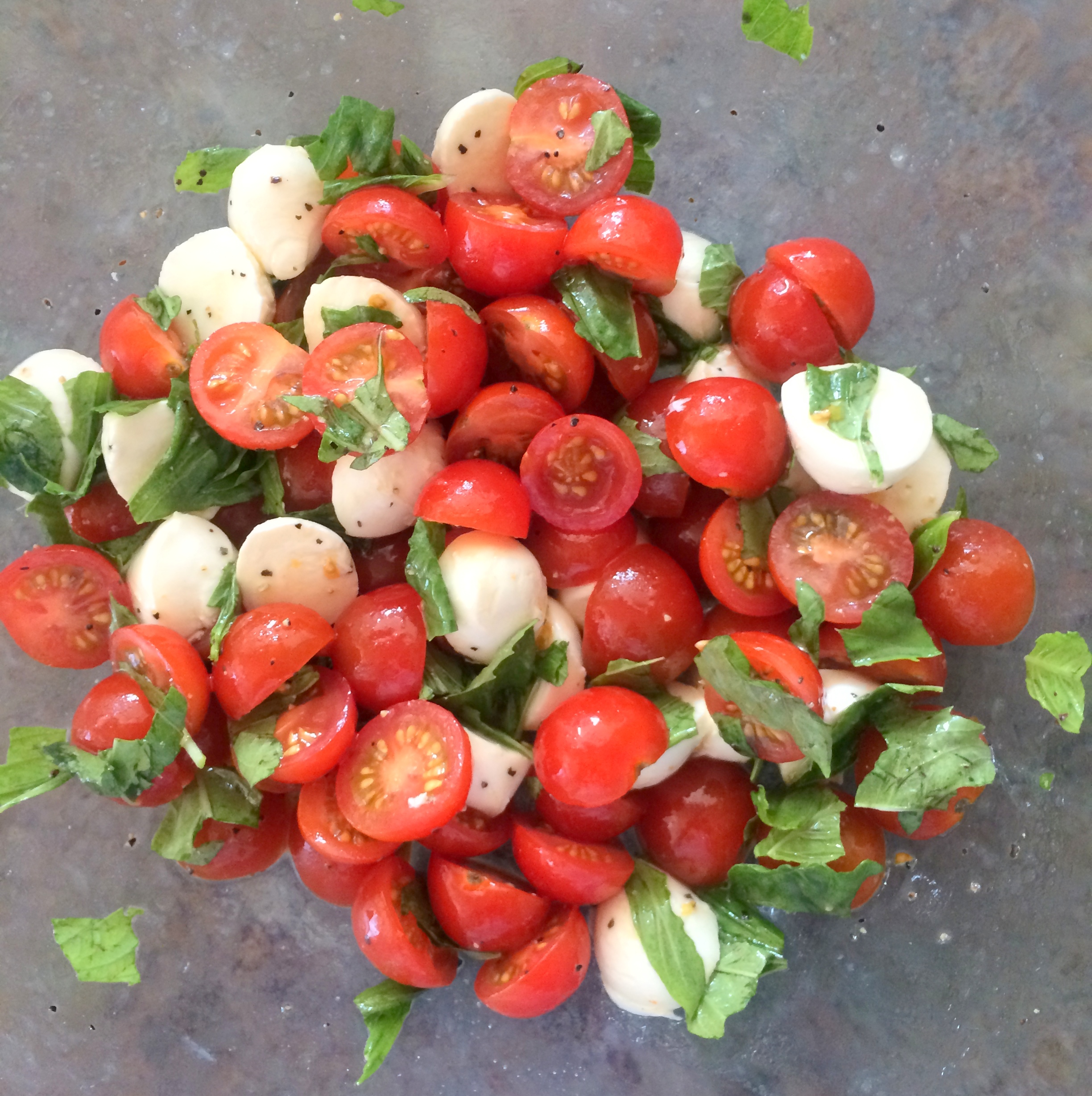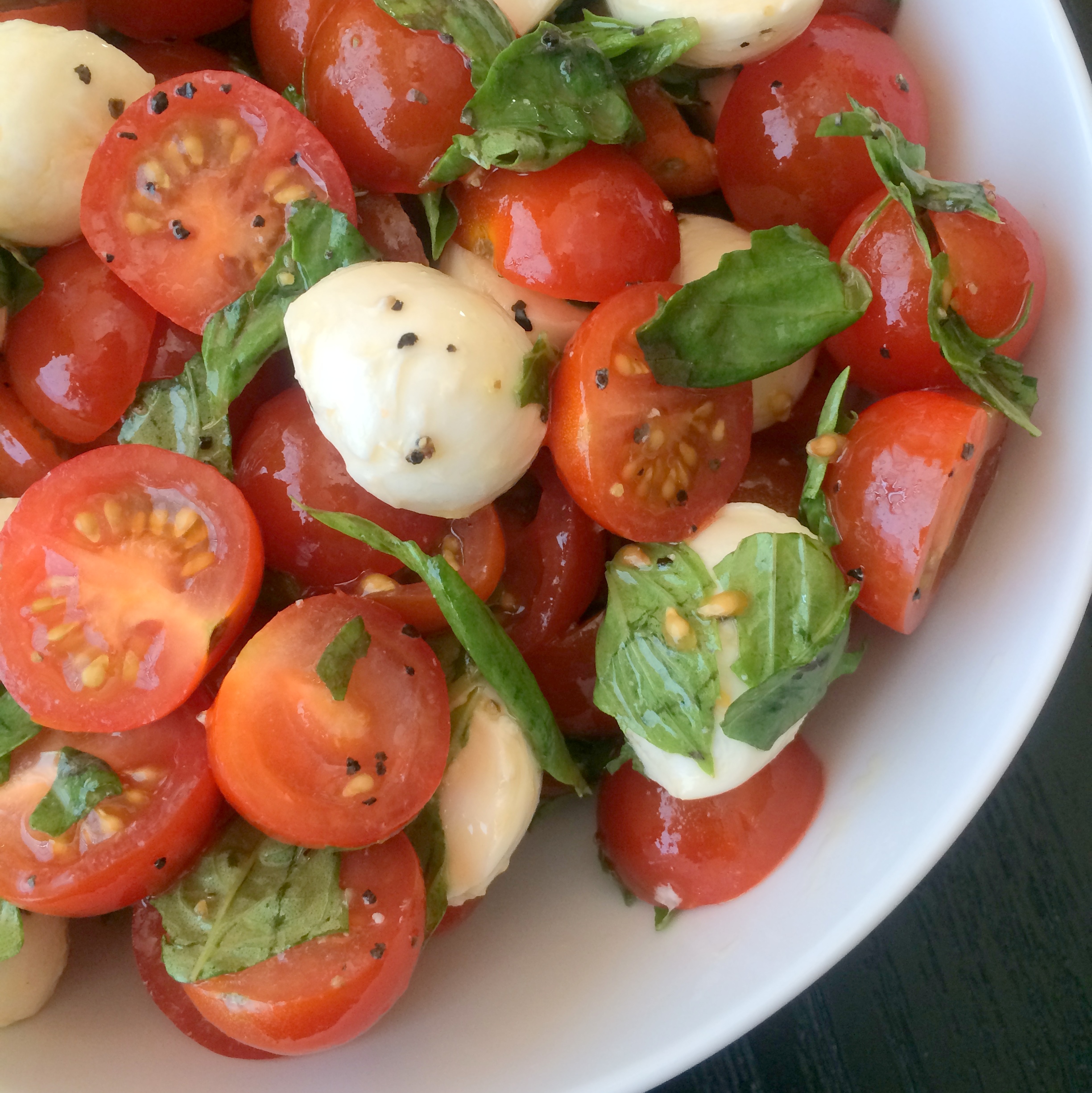Happy Labor Day! I hope you are all enjoying a nice warm day off and the last unofficial hours of summer! This weekend, I went to the Jersey shore for the first time all summer (and last) and had an amazing day at the beach followed by a fun relaxing night on the deck with my friends. Yesterday I enjoyed the a little party at my friend’s house and because I love making food for such get-togethers, I threw together this quick Cherry Tomato Caprese Salad which was perfect on such a hot and sometimes sunny (and sometimes stormy) day.
