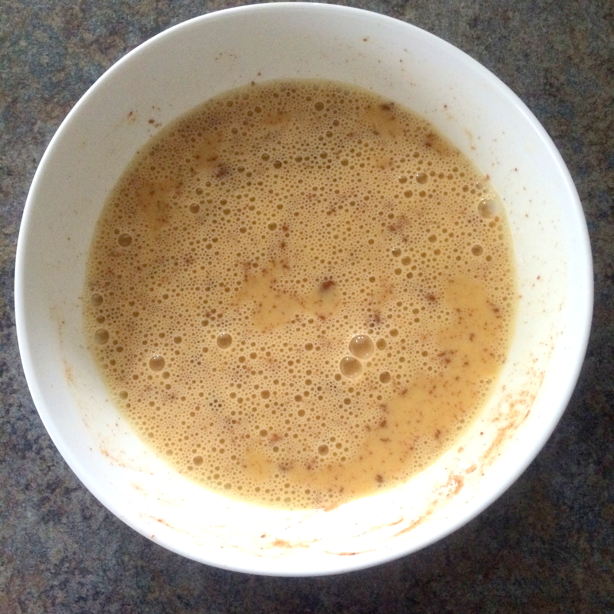 In a medium bowl, whisk the eggs, milk, thinly sliced asparagus and cheese. Season with pepper.