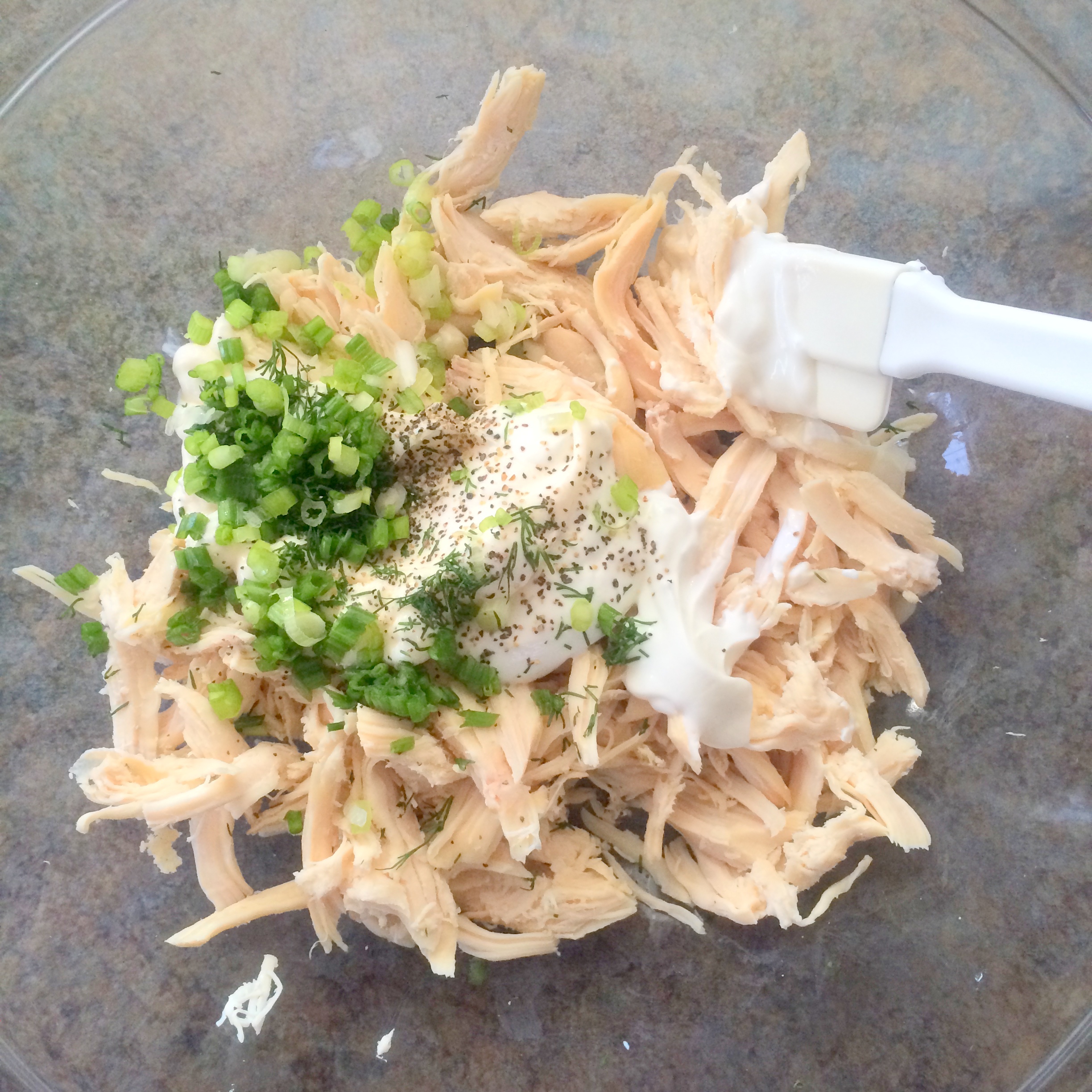 Preheat broiler to high. Combine chicken, yogurt, mayonnaise, dill, salt, pepper and scallions in a medium bowl; stir well.
