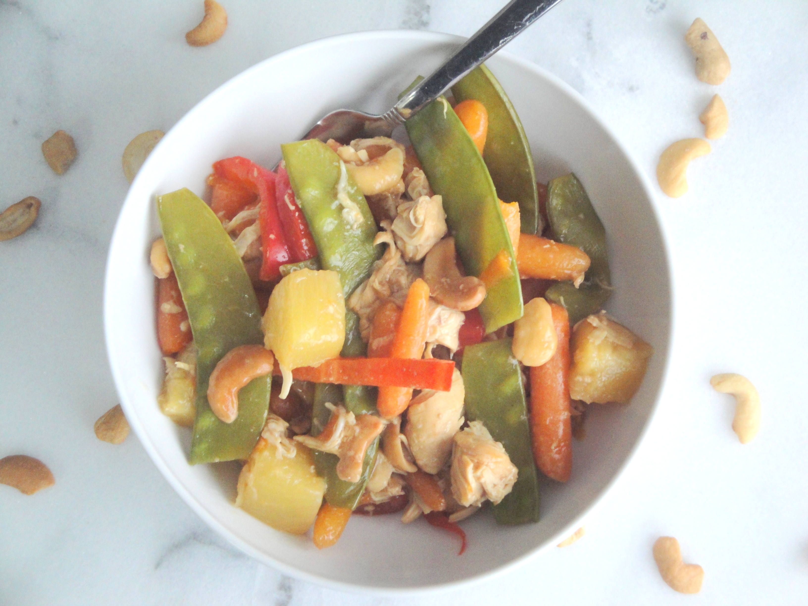 An Asian-inspired sauce made up of soy sauce, hoisin, rice vinegar and sherry is added to garlic, ginger, rotisserie chicken and packaged coleslaw and heated briefly before being spooned into lettuce cups and topped with scallions and nuts. I used broccoli slaw instead of regular coleslaw which stayed pretty crunchy even after being heated and the scallions add a fresh mild onion flavor. I also used peanuts instead of cashews because I had peanuts on hand but any nut will work or you can leave it out altogether. Because this dish uses precooked chicken, it comes together really quickly making this an easy weeknight dinner. If you are looking for something light, fast, low-carb and very tasty, this is a dish for you.