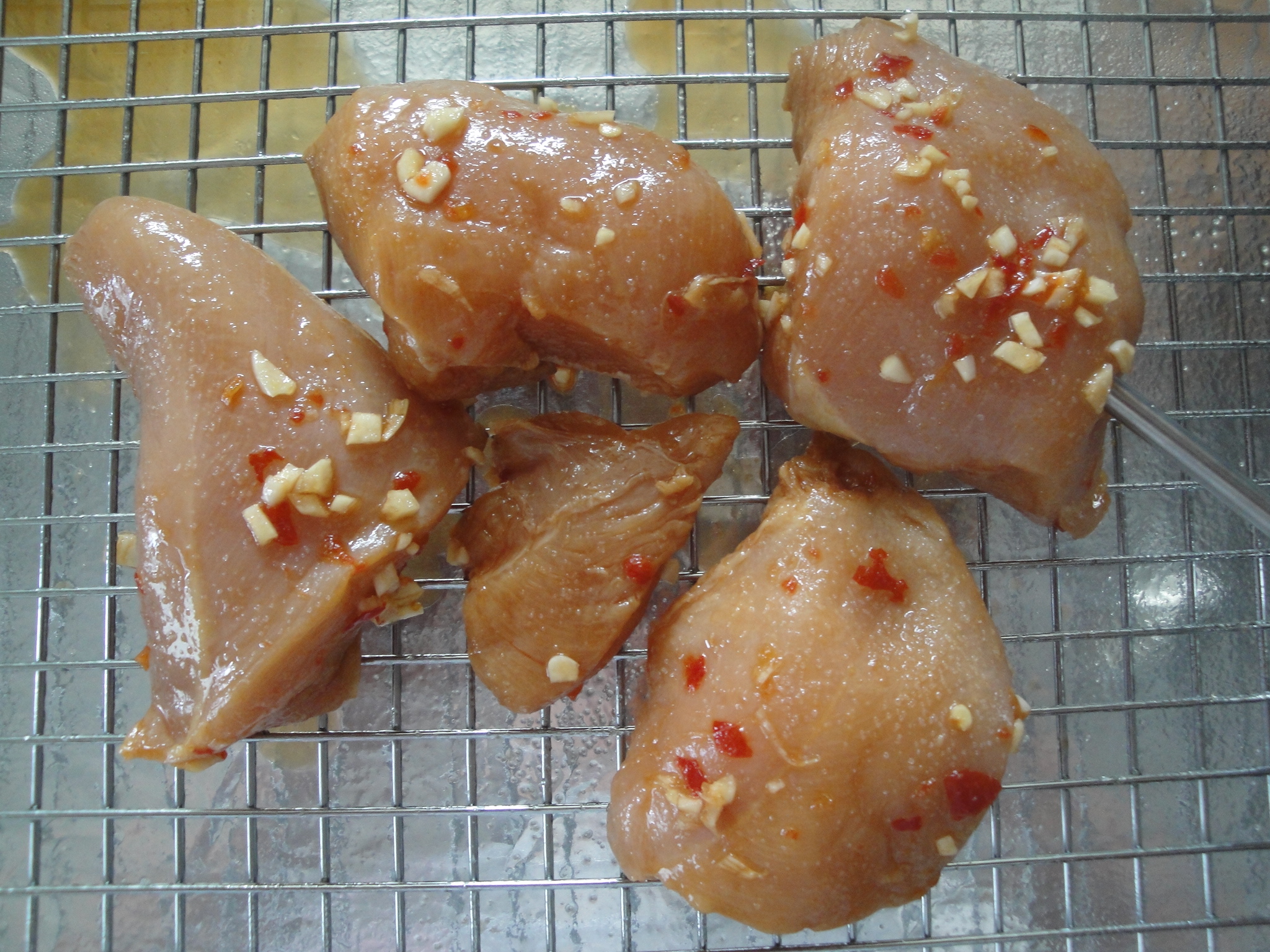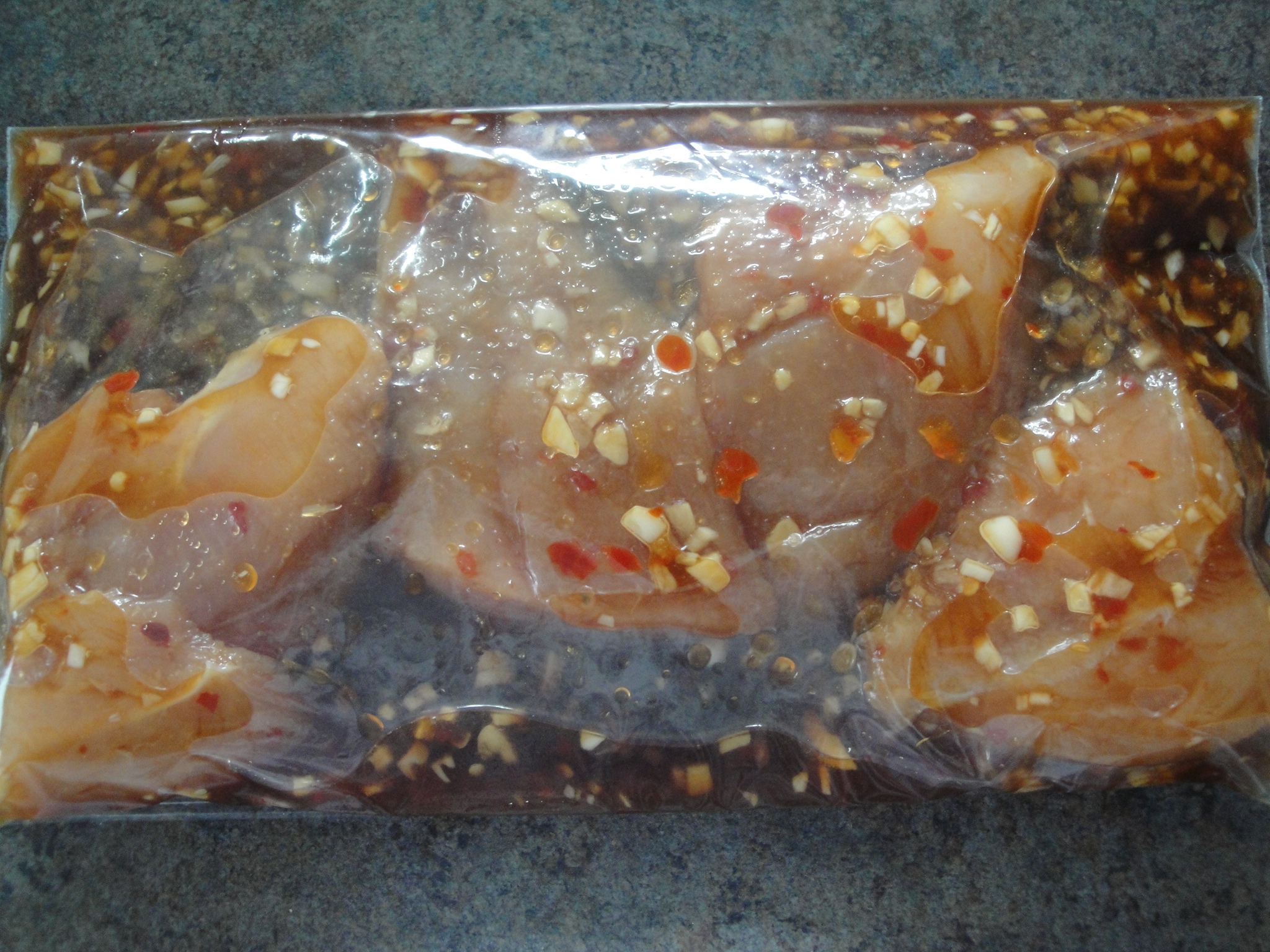 Pour vinegar mixture into a zip-top plastic bag and add chicken. Marinate in the refrigerator for one hour, turning occasionally. Remove chicken from bag, reserving marinade.
