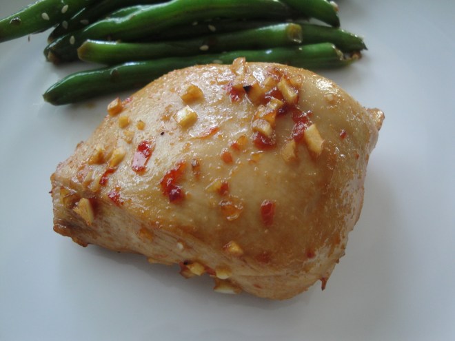 I don’t know how or why or when this happened but I’ve become a total sucker for homemade Asian-inspired dishes. I’ve always loved soy sauce and often would eat plain white rice and soy sauce when I was a vegetarian. Now that I’ve discovered other heavy-hitting flavors, like ginger, chili sauce, peanut sauce, and sesame oil, I’ve realized what I’ve been missing out on. This Asian-Glazed Chicken combines some of those flavors for a slightly sweet, slightly spicy, and overall delicious chicken dish. Chicken breasts are marinated in a mixture of rice wine vinegar, soy sauce, honey, sesame oil, chile paste, and garlic and baked until perfect. The marinade, which is later cooked and used as a basting sauce, is sweet, tart, spicy, and garlicky. As usual, I used chicken breasts but this recipe uses chicken thighs so use whichever you prefer. I served this with some Asian-inspired green beans which I’ll have for you later this week!