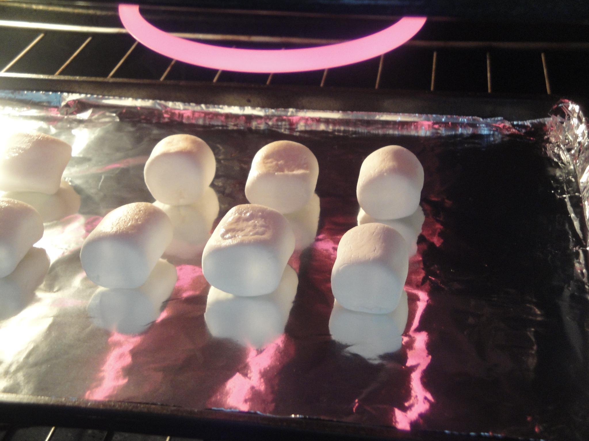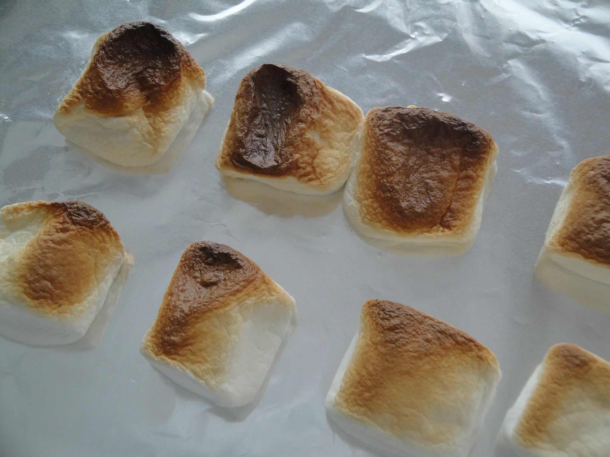 Broil 8 marshmallows until desired brownness on one side and carefully flip over to brown the other side. (I broiled mine 1 1/2 minutes on the first side and 45-50 seconds on the opposite side.)