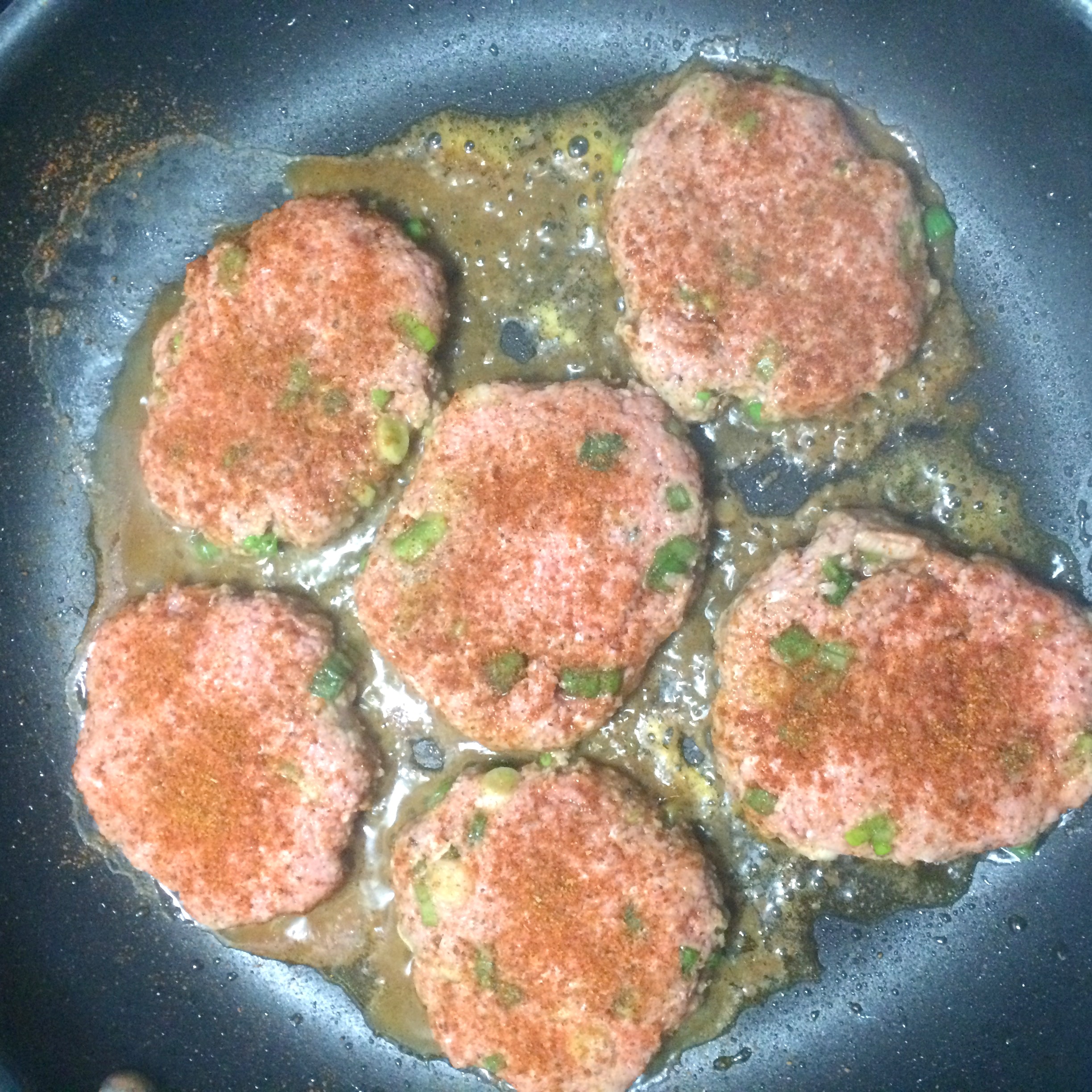 Divide mixture into 4 equal portions; gently shape each into a 1/2-inch-thick patty. Press a nickel-sized indentation in center of each patty. Sprinkle with salt and pepper. Place patties on grill rack or pan coated with cooking spray; grill 5 minutes. Turn patties; grill 3 minutes.