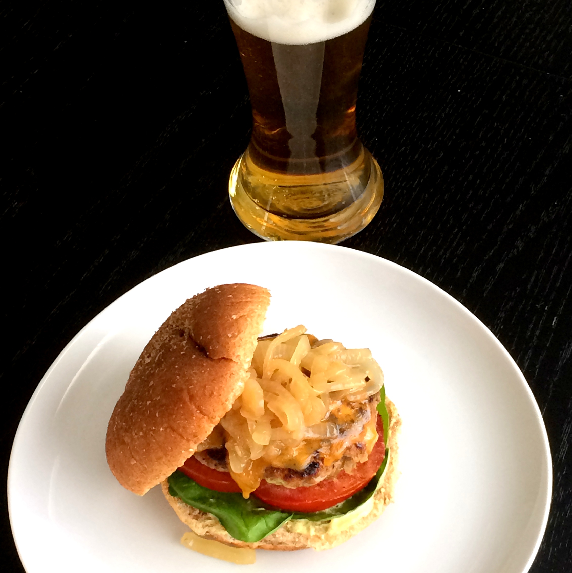 This turkey burger is flavored with beer-infused caramelized onions which help to keep the meat juicy and vibrant. I used the seasonal beer Sam Adams Porch Rocker instead of Summer Ale but any beer can be used. A mayonnaise-mustard spread, cheese, tomato and lettuce top this burger – oh and another big dollop of caramelized onions. For someone who absolutely hated onions as a kid, I’ve found a newfound respect for this veggie, especially when it’s softened up with some beer! So, it’s summer and it’s another burger. But isn’t that what summer is for?