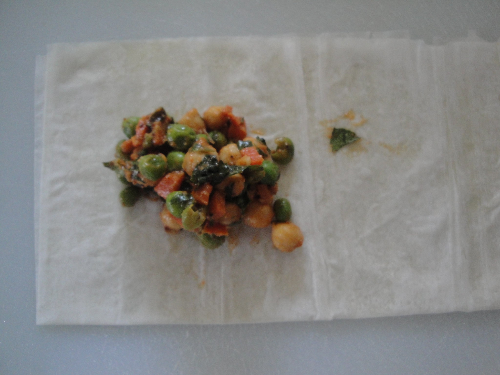 Fold phyllo dough layers in half lengthwise and flatten with your hand. Place a spoonful of the chickpea mixture at one end of the dough. Carefully fold one corner of the phyllo over the mixture into a triangle.