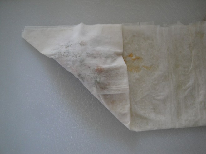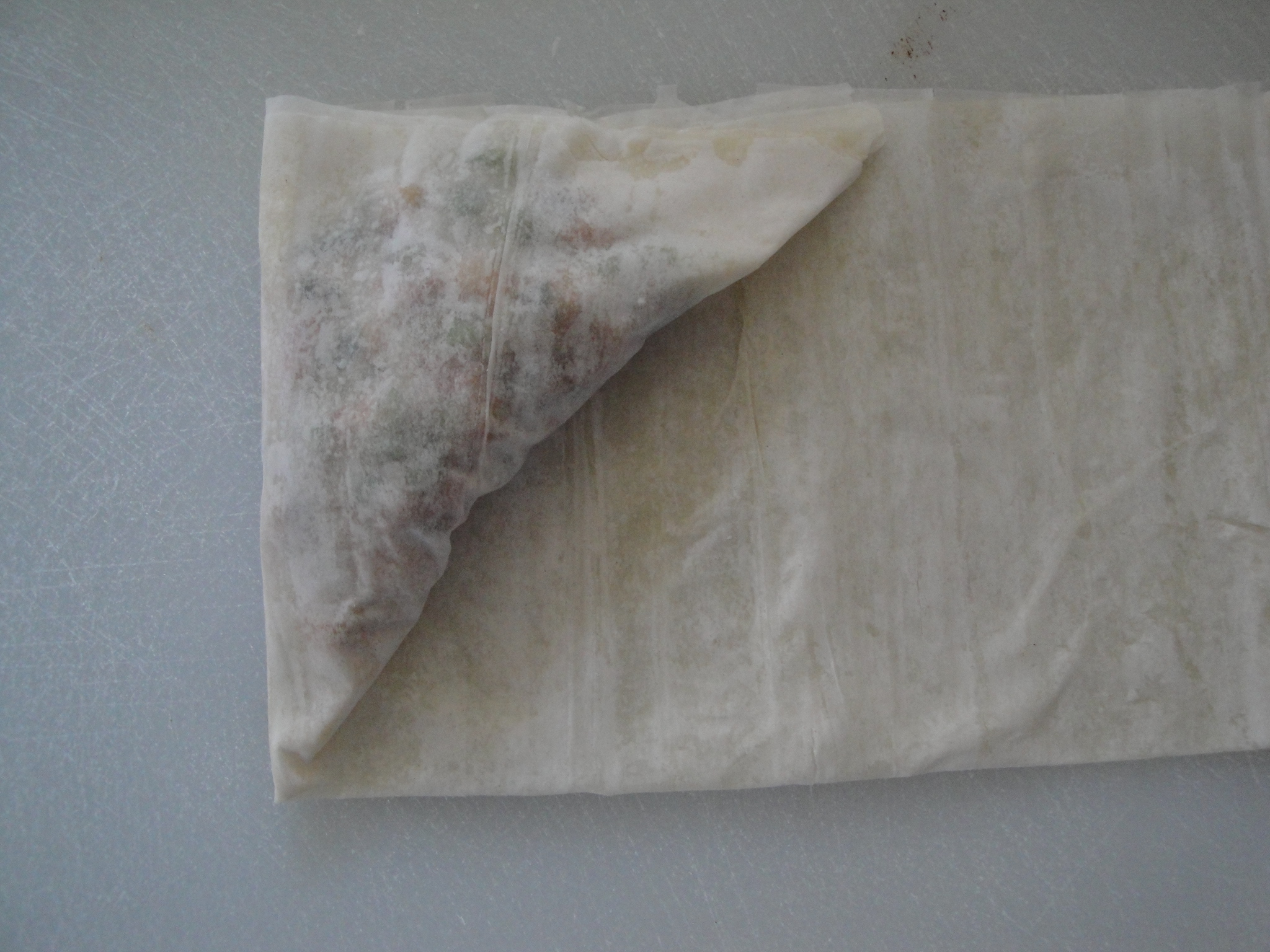 Unroll the thawed phyllo dough and cover with a damp towel or paper towel to keep it from drying out. Take one layer of the phyllo, lay it on a flat surface and spray with non-stick spray. Carefully place another layer of phyllo on top of the first one and spray with non-stick spray as well.