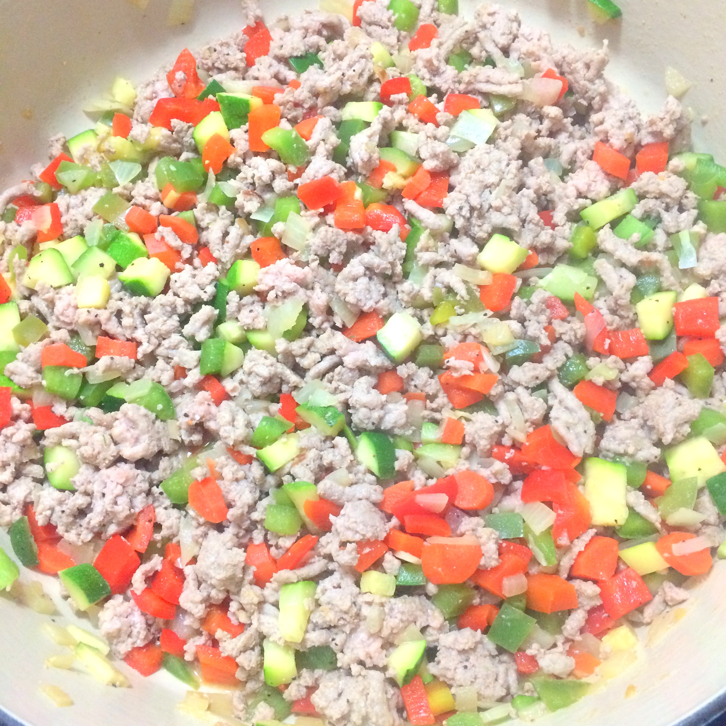 Melt coconut oil in a large pot or Dutch oven over medium-high heat. Add onion, green pepper, red pepper, zucchini, and carrot. Cook until vegetables soften, approximately 6 minutes.