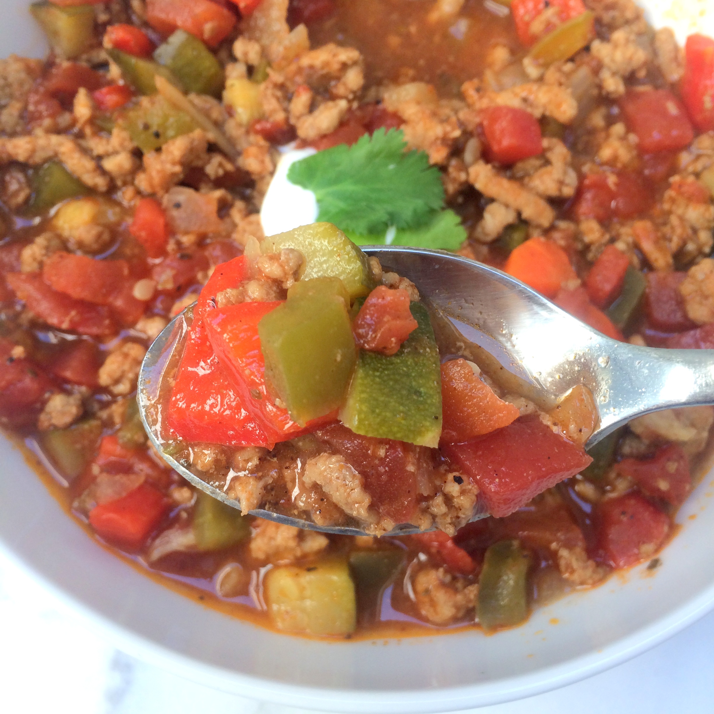 I think I’m a little bit obsessed with this chili. I’ve been eating a bowl of it every single day. And when it ran out? I made another batch. And another. All of this started because I had one lonely zucchini sitting in my produce drawer that I wanted to do something with. After taking a look around, I realized all the other vegetables I had on hand and decided right then and there to throw them all in a chili. I happened to have canned tomatoes and ground turkey on hand anyway so it was a no brainer. The result is this Chunky Turkey and Veggie Chili.