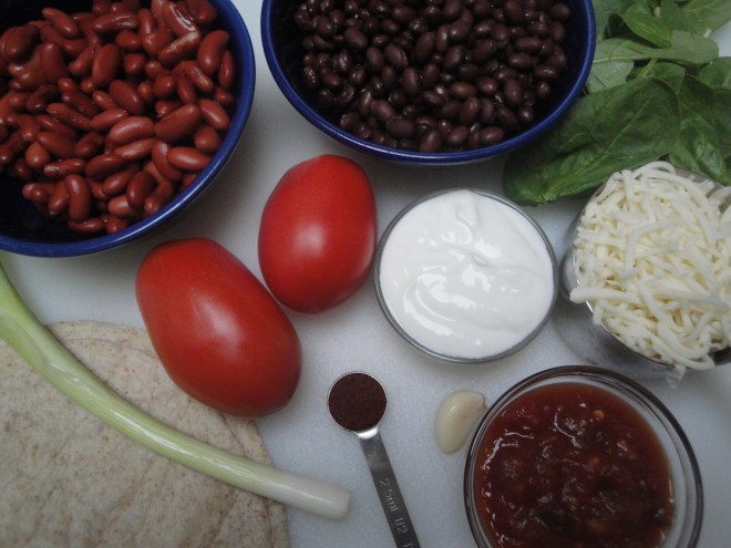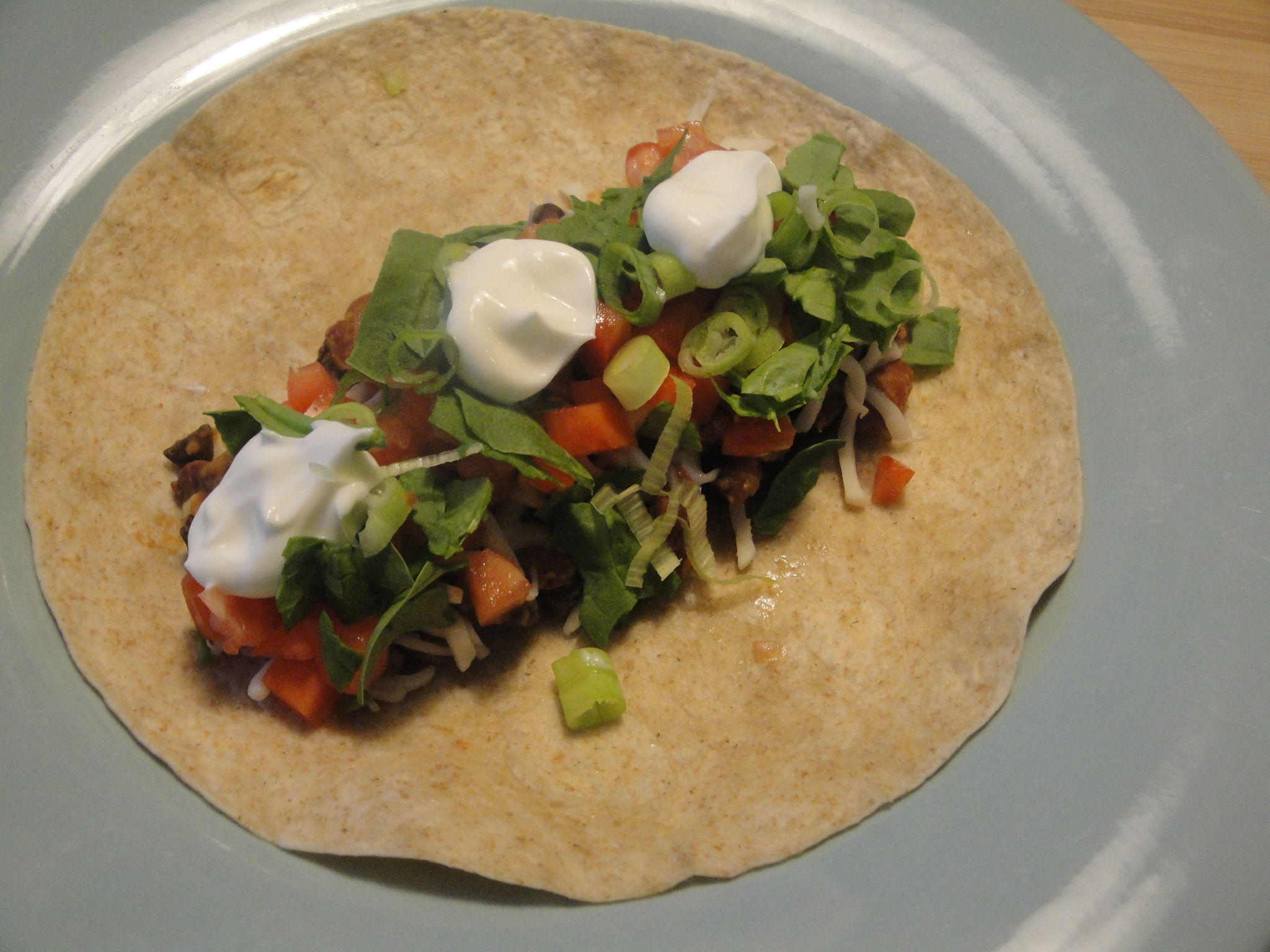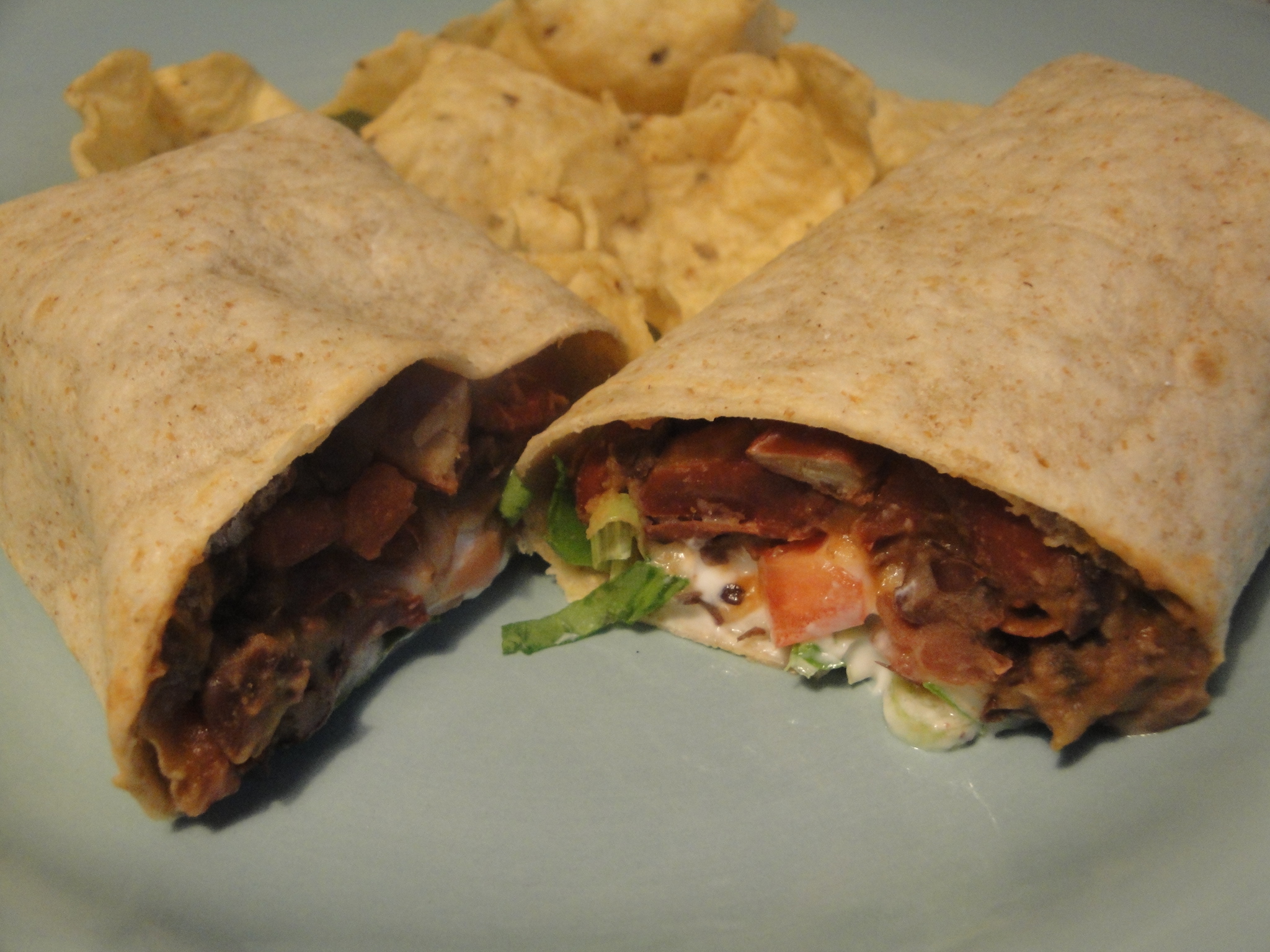 When I was a vegetarian, I always had black beans in my pantry and ate a lot of burritos.  These Chipotle Bean Burritos mixes black beans with kidney beans along with a touch of chipotle chile powder.  The chile powder provides a slight heat that you don’t really notice it until after the third or fourth bite.  The combination of the mashed beans with the whole beans provides different textures.  The toppings are standard: tomato, lettuce, scallion, cheese, and sour cream.  I’m not a raw onion fan but liked the scallions here which provided a slight crunch.