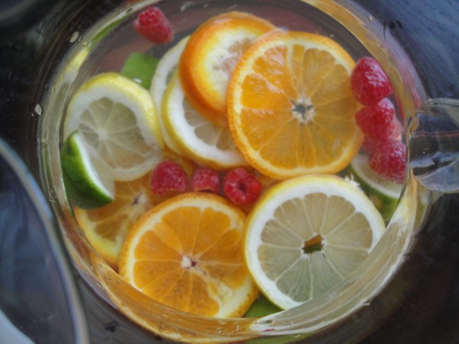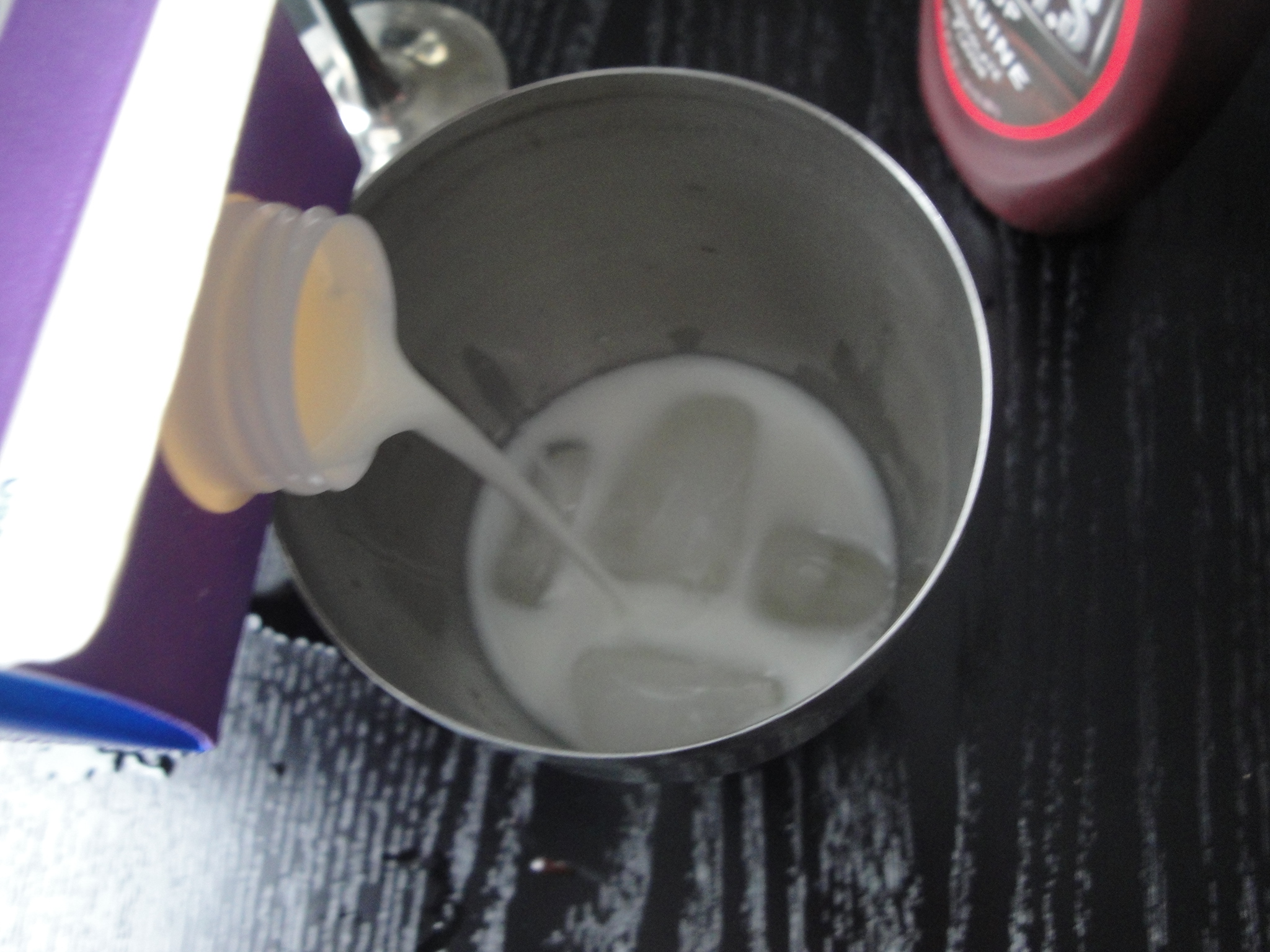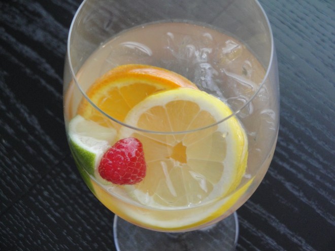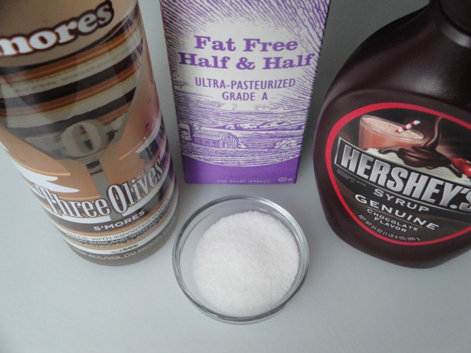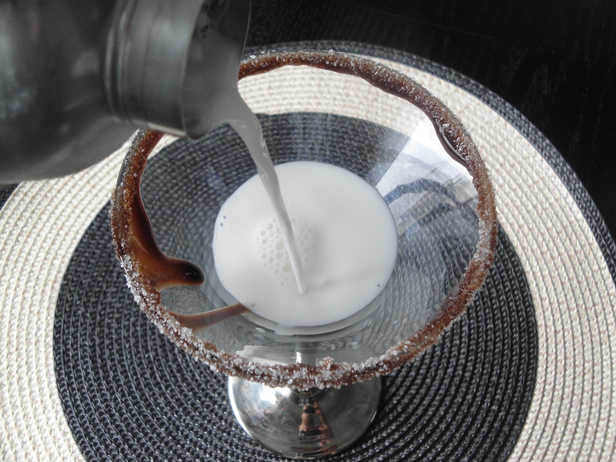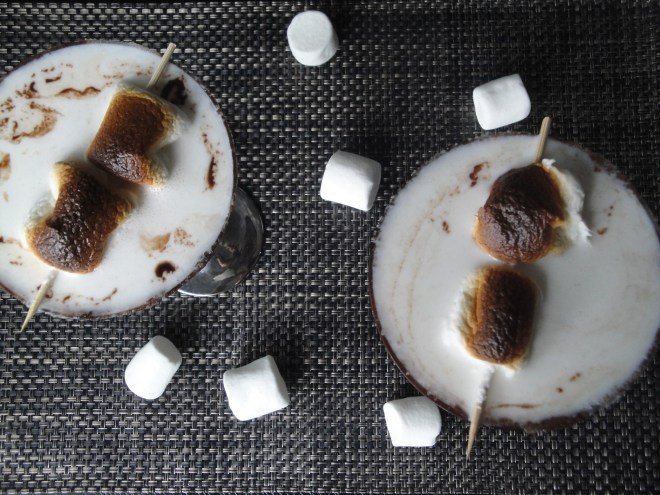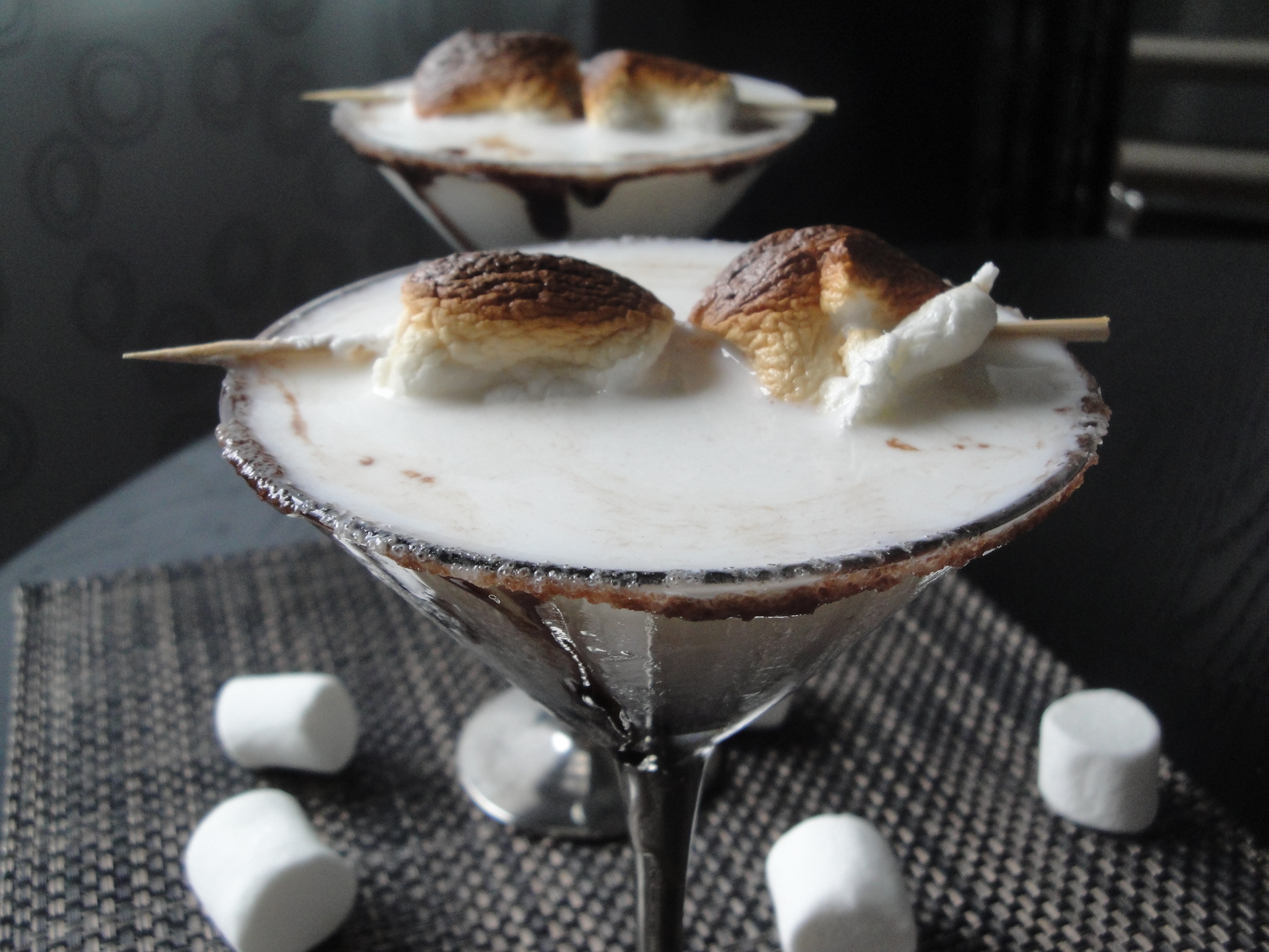 S’mores flavored vodka is mixed with half-and-half and served in a chocolate-sea salt rimmed martini glass. I’m a big fan of Three Olives Vodka so when I saw the S’more flavored bottle, I didn’t know whether to be excited or frightened. But I went for it because if I were on a deserted island, I would want to have s’mores with me. So why not a s’mores cocktail too? This cocktail is good but I think I’m going to experiment with it a bit. I’d probably omit the salt, mix chocolate syrup in with the half-and-half, and maybe add in some Baileys or chocolate liqueur. There are all kinds of possibilites with this.